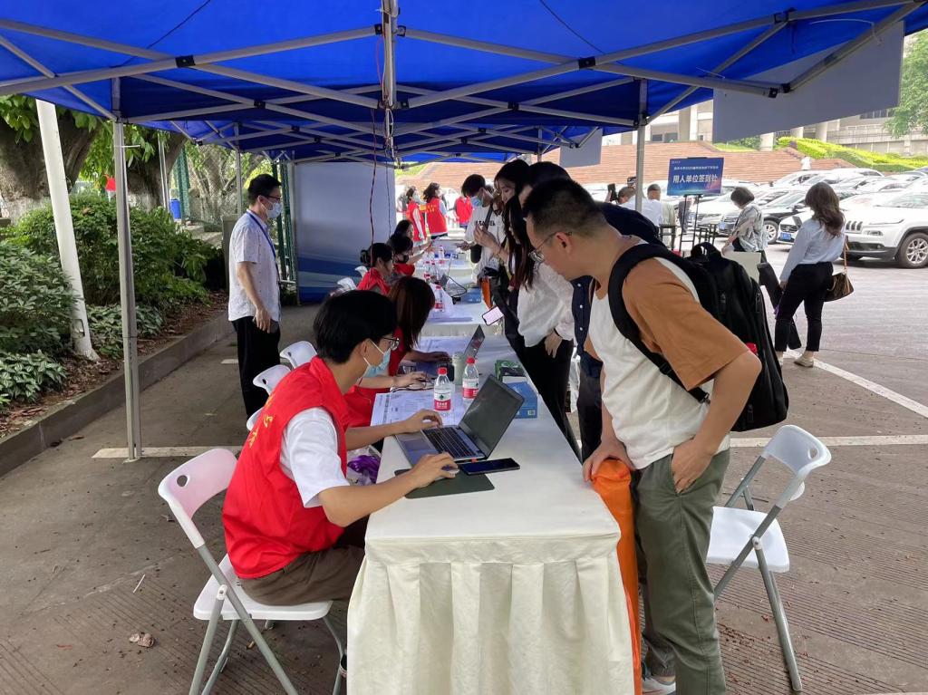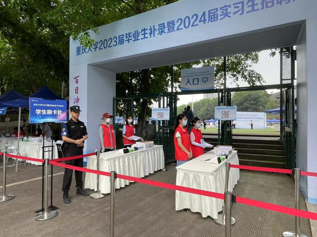 团结广场入口处的志愿者们耐心引导用人单位代表签到登记、参会学生刷卡进场,现场人员进出井然有序;场内志愿者热情协助用人单位进行布展宣传,并依照相关规定对宣传物料进行辅助检查;志愿者服务点则随时供应饮用水与纸、笔等各类文具,并由志愿者向前来咨询的人员提供指引与帮助。烈日炎炎,志愿者们在老师和各小组长的调度下有序轮岗,无论在何种岗位开展工作,都一丝不苟、精神饱满。参与本次双选会的用人单位代表和师生纷纷表示,志愿者们服务贴心、热情周到,展现出了重大学子的良好素质和积极面貌,体现了学生党员乐于奉献的模范带头作用。