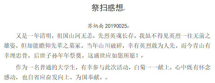 黄诗怡同志表示:“通过‘网上祭英烈’为烈士们献上一束花,敬上一杯酒,向烈士们写下自己的寄语,表达自己对他们的感谢,同时也让我们感受到了今天的幸福来之不易,作为一名青年大学生,要肩负好历史使命,为中华民族的伟大复兴积蓄力量。”