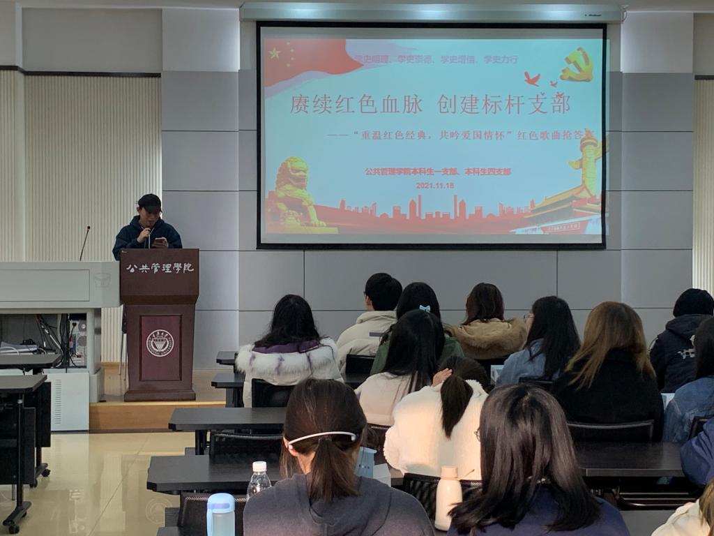 本科生一支部、四支部于学院楼102教室举办“赓续红色血脉,创建标杆支部”系列活动之“重温红色经典,共吟爱国情怀”红色歌曲抢答赛。出席本次活动的有一支部书记王丽娟同志、四支部书记李阳阳同志,学院本科生一、四支部全体党员参加比赛。