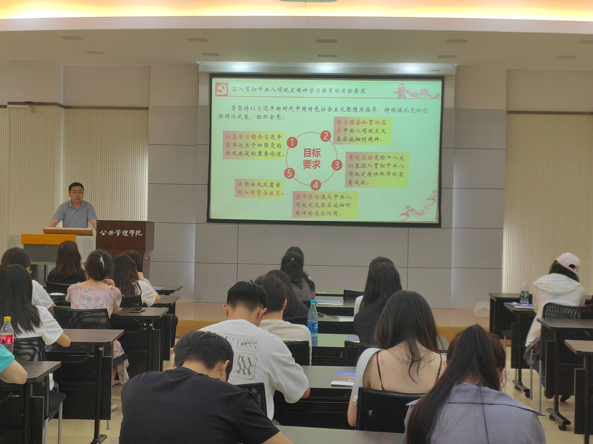 汪涛教授从深入贯彻中央八项规定精神学习教育的重要意义、目标要求、精神内容、相关制度规定和违反中央八项规定精神典型案例五个维度展开系统讲解,并结合亲身经历,严肃指出:“从中央到基层,我们党对‘踩红线’、闯‘雷区’的作风问题始终坚持零容忍态度。”他强调,八项规定是全面从严治党的“金色名片”,是密切党同群众血肉联系的“关键纽带”,更是学院营造风清气正育人环境、推动高质量发展的“生命线”。我们党就是在不断剖析自我、革新自我和净化自我的过程中取得成功。