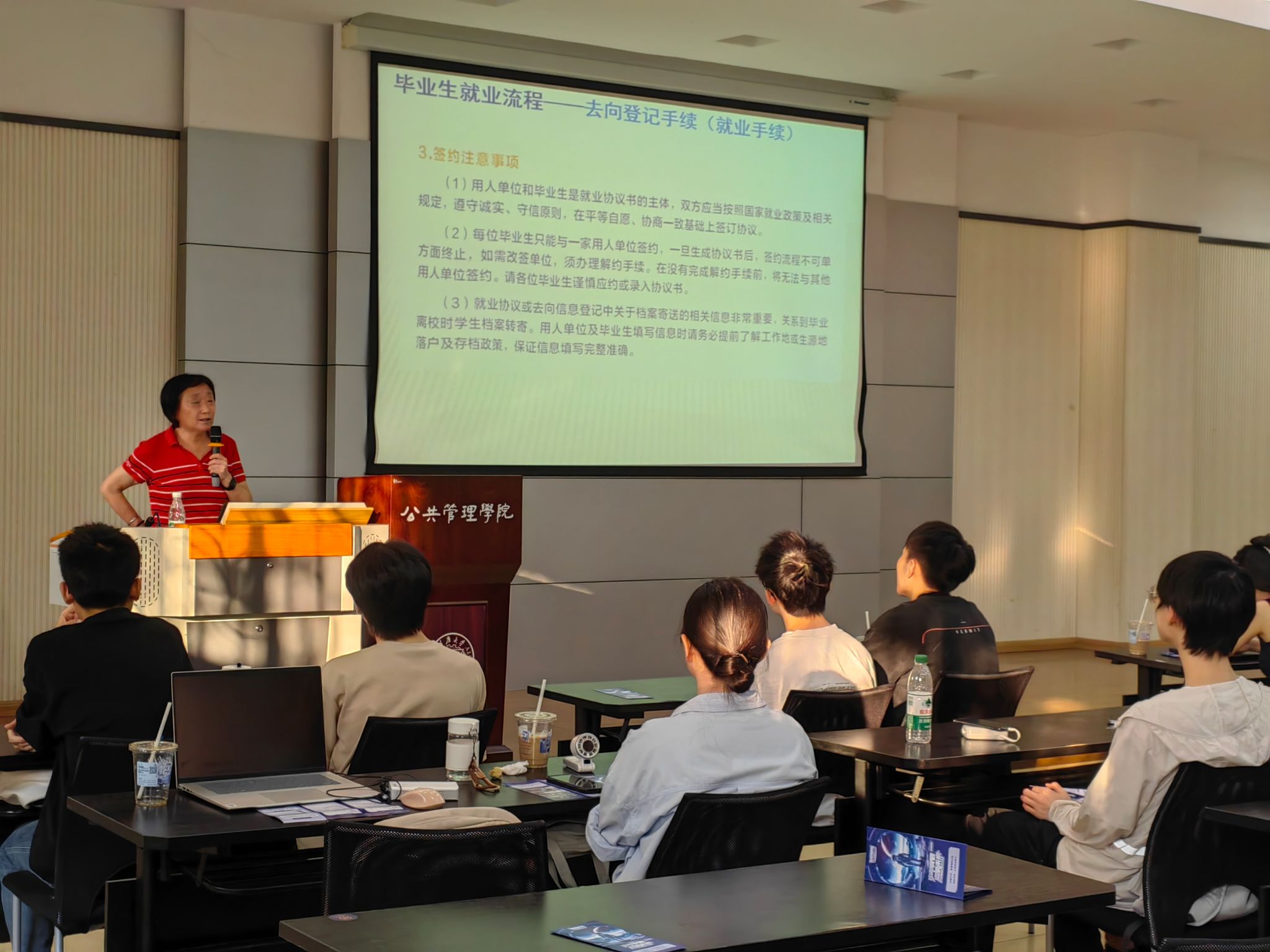 在就业相关问题指导环节,王丽娟书记对不同就业方向提供针对性建议,并重点聚焦“签约注意事项”。她特别提醒大家,务必提前了解工作或生源地的落户、存档政策,保证信息填写完整准确。