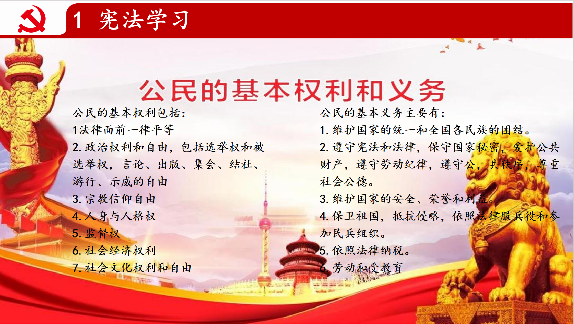 紧接着,邓彤带领同学们细致地学习了中华人民共和国宪法的概念、性质、地位和核心内容,并具体讲解了公民的基本权利与义务。宪法是国家的根本法,是治国安邦的总章程。因而,全面学习理解宪法将有助于同学们牢固树立总体国家安全观,将维护国家主权、安全、发展利益的主动权牢牢掌握在自己手中。