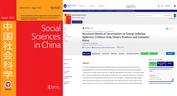 龙少波教授与其博士生冯文庆的研究成果“Structural Shocks of Uncertainties on Energy-Inflation Spillovers: Evidence from China’s Producer and Consumer Prices”在《中国社会科学(英文版)》(Social Sciences in China)发表。