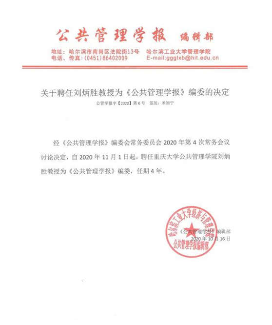"Journal of Public Management" is a core journal of CSSCI and a quarterly journal with high academic value in the field of public management. Since its foundation in 2003, the published academic papers mainly involve "government management, public policy analysis, public health management, social security" and other research topics related to public management disciplines, focusing on fact-based empirical research in research methods, emphasizing the applicability and application value of research results in Chinese scenarios, and aiming to prosper and deepen Chinese public management academic research, and exploring strategies and ways to improve the level of government governance. This time, Professor Liu Bingsheng was invited to serve as an editorial board member of the Journal of Public Management, which is of great significance to enhance the influence of Chongqing University in this discipline.