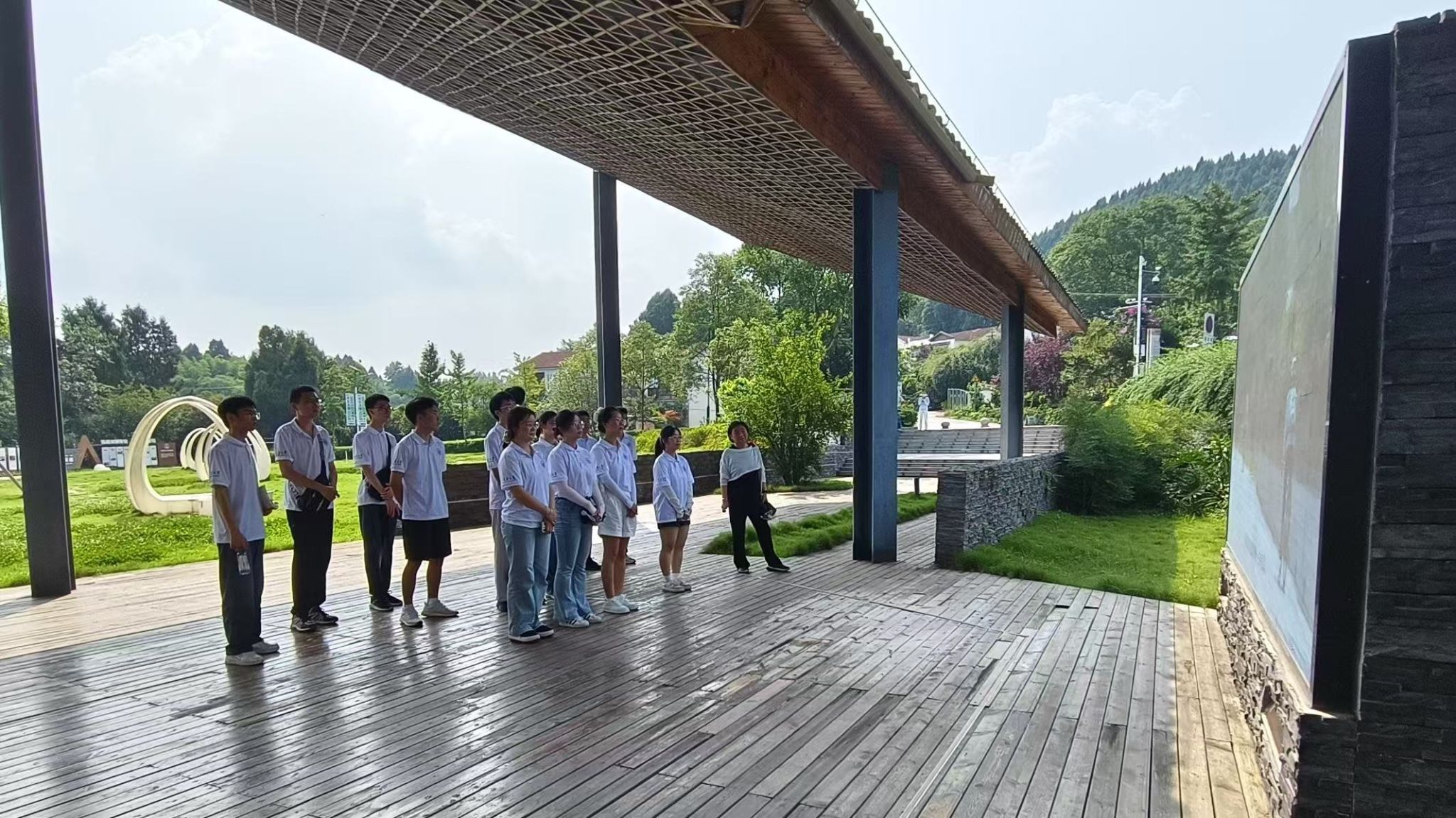 在讲解员的引导下,实践团成员深入村子的各个角落展开调研。这里有咖啡、陶艺、扎染等多种新业态,通过引入多元业态,形成了完整的产业链,不仅增加了村民收入,还提升了村子的知名度。实践团成员围绕产业发展模式,结合公共管理专业特色,积极讨论如何优化产业布局、提升产业竞争力,将理论知识与实际案例深度融合,探索推动乡村产业可持续发展的实践动力。