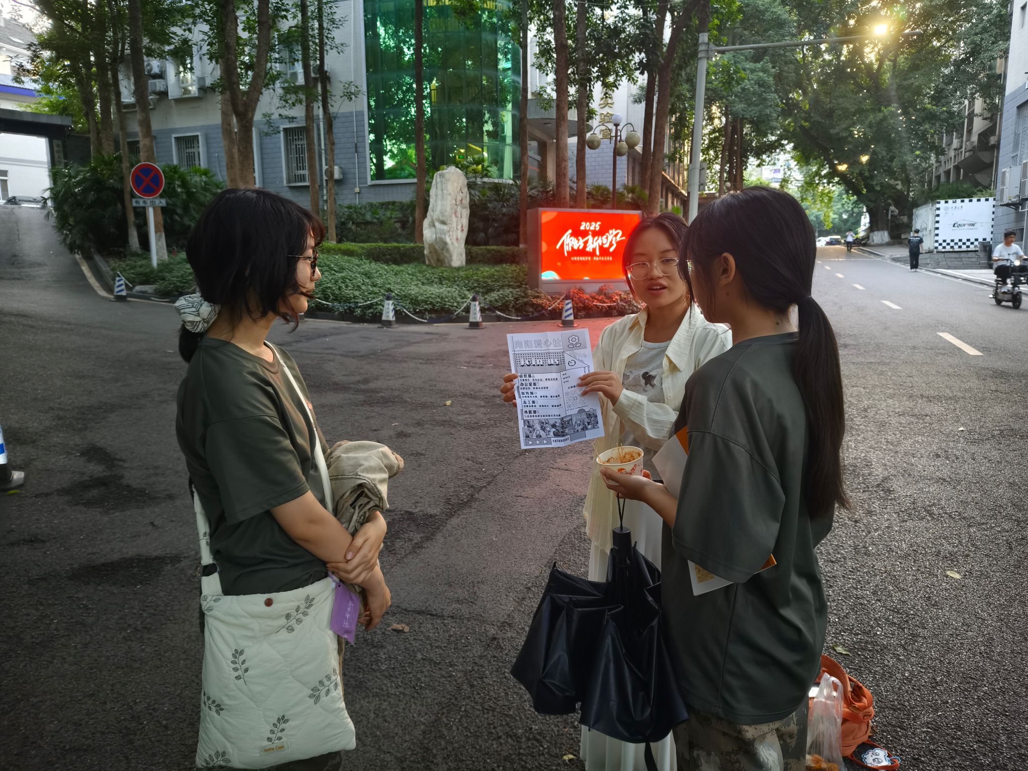 A区小竹林的纳新点别具一格,绿荫掩映下的场地洋溢着轻松活泼的氛围。为了让大家更深入地了解社团的运作模式,社员们精心设计了多个互动环节:既有考验志愿服务常识的"爱心知识问答",也有模拟真实服务场景的"情景模拟"小剧场。同学们在问答中加深了对公益理念的理解,在角色扮演中切身感受到爱心活动的意义与价值。现场欢声笑语此起彼伏,不少同学还在社员的引导下,分享了自己对公益活动的见解和期待。这种寓教于乐的互动方式不仅拉近了彼此的距离,更让志愿服务的精神内涵深入人心。活动尾声,许多同学意犹未尽,纷纷在报名表上郑重地写下自己的信息,眼神中满是对未来参与社团活动的憧憬与决心。