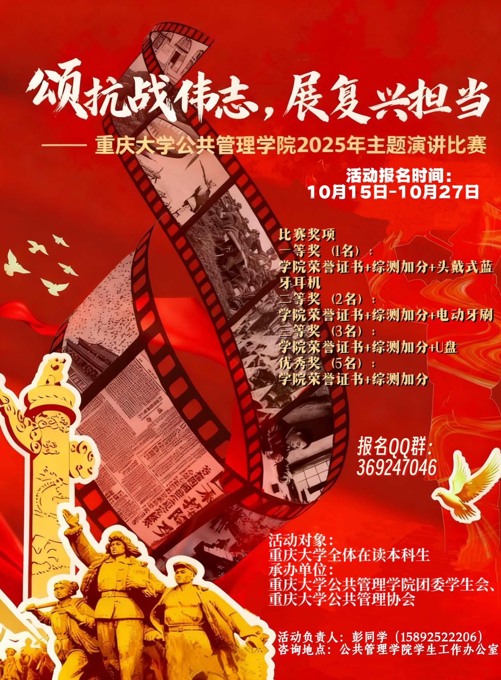 团委学生会与公共管理协会联合主办的“颂抗战伟志,展复兴担当”主题演讲比赛正式启动报名,截至目前已有22名同学成功报名,报名通道将持续开放至10月27日。