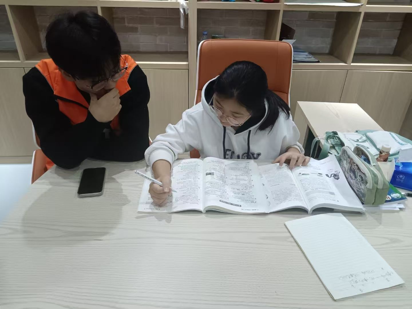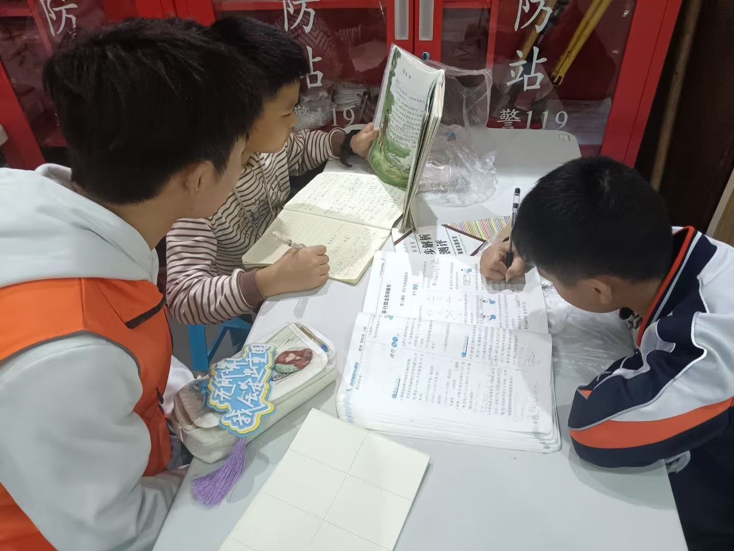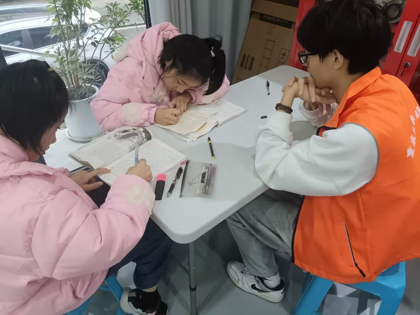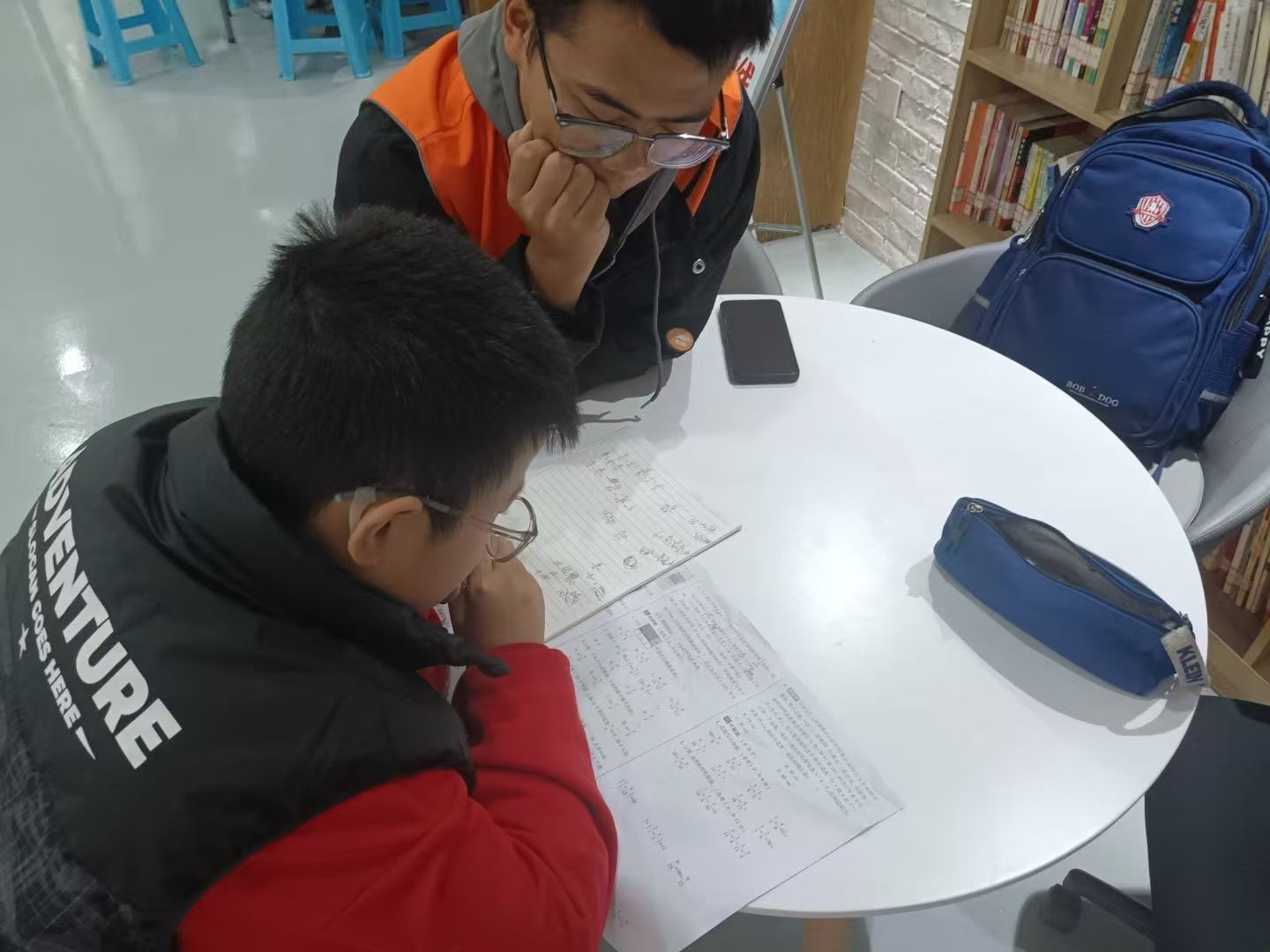 活动现场,身着橙色社服的志愿者们耐心解答小孩子们的每个问题,并仔细观察他们在独立作业时遇到的困难和思路上的误区,力争让孩子们听得懂、学得会。