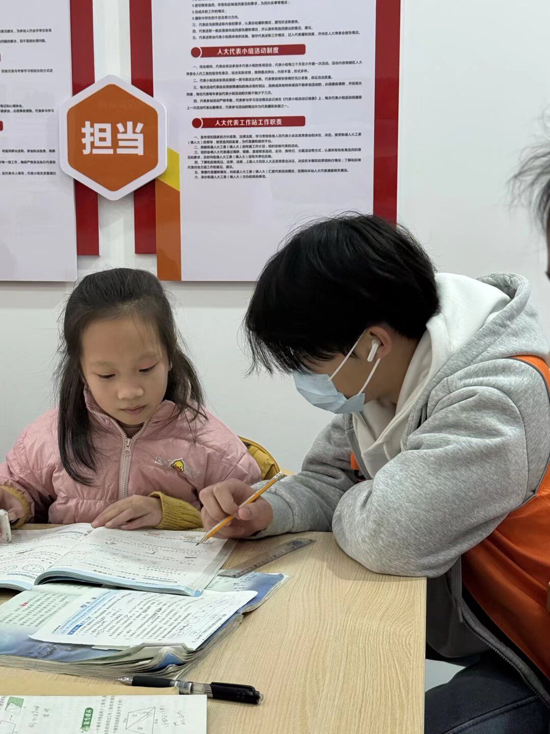 活动现场,身着橙色社服的志愿者们成为了最温暖的风景。他们俯下身子,耐心解答孩子们在作业中遇到的难题,仔细观察孩子们的解题思路,及时纠正误区,力争用最通俗易懂的语言让孩子们扫除知识盲点、学有所获。