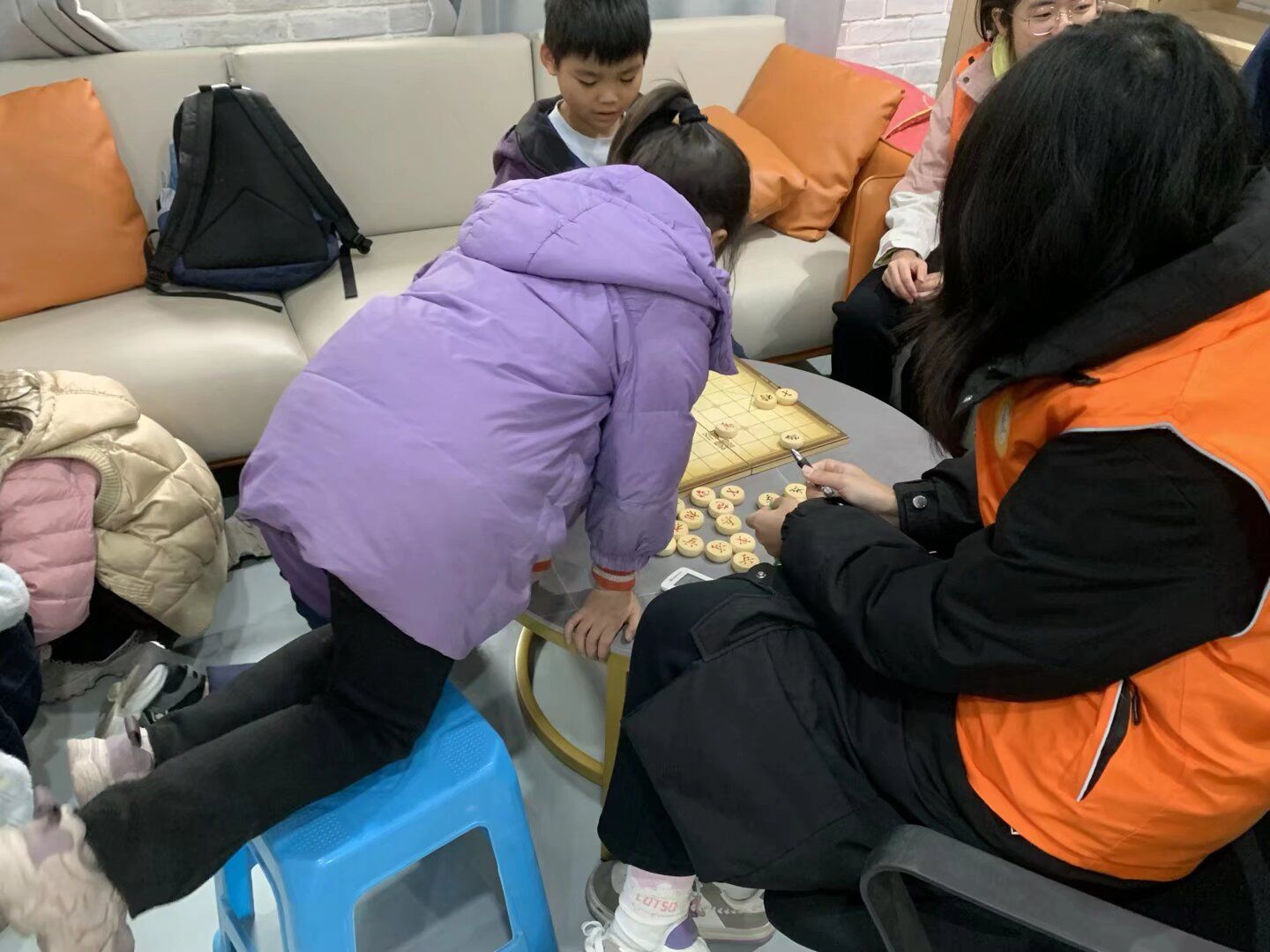 在象棋互动环节,志愿者们同样保持着极大的耐心。在志愿者们的陪伴与指点下,孩子们在“楚河汉界”上排兵布阵,体验博弈的乐趣。志愿者耐心地讲解行棋规则与战术策略,孩子们从最初的思考犹豫到后来的落子如飞,沉浸在思维的交锋中,现场充满了欢声笑语。
