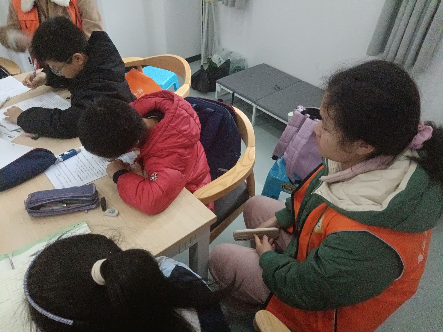 活动现场,身着橙色社服的志愿者们成为了冬日里一抹温暖的亮色。他们围坐在长桌旁,耐心地解答孩子们提出的每一个疑问。从照片中可以看到,志愿者们时而俯身仔细查看孩子们的解题步骤,时而轻声细语地点拨思路上的误区,力争让每一个孩子都能把难题“听得懂、吃得透”。