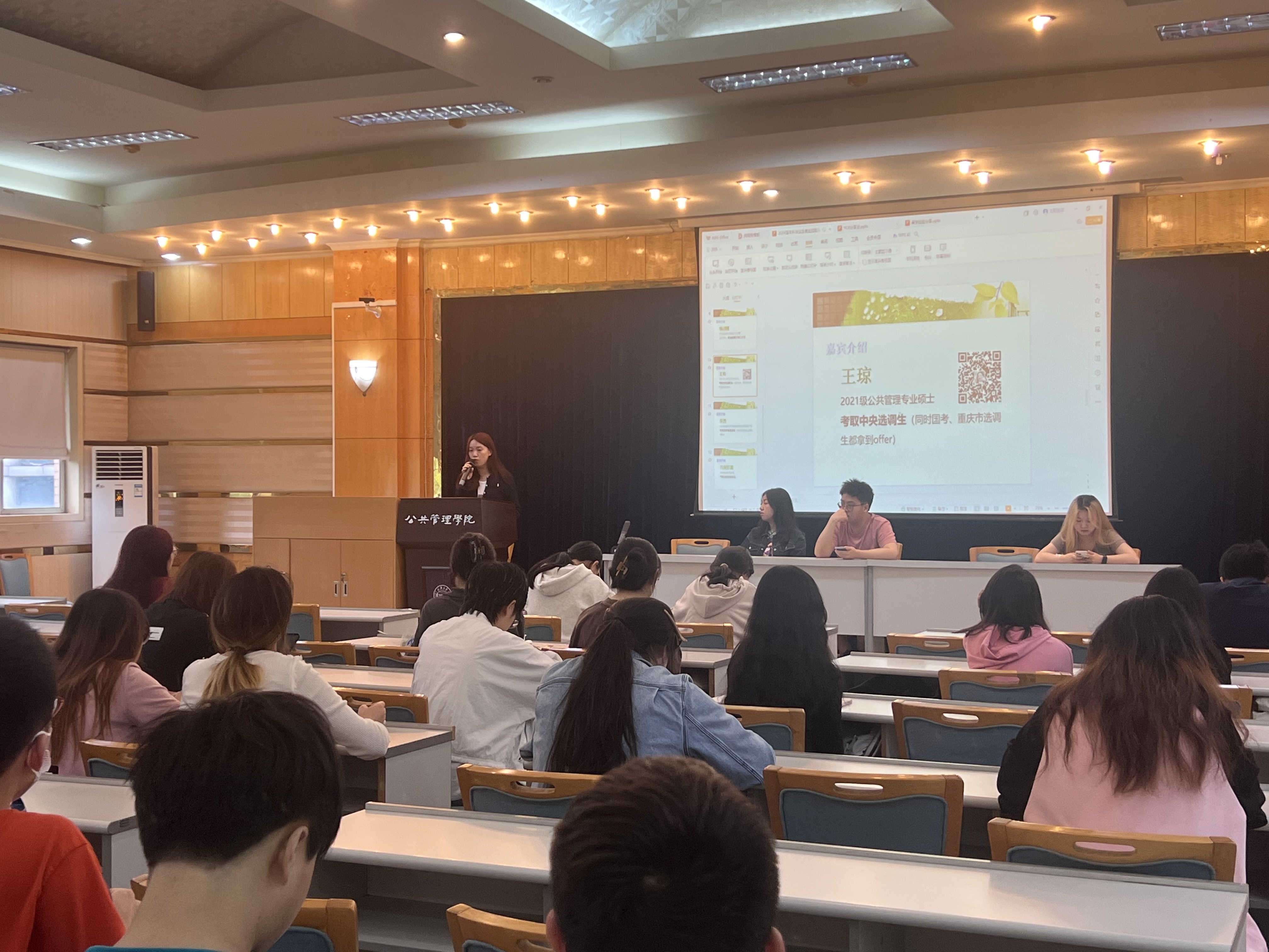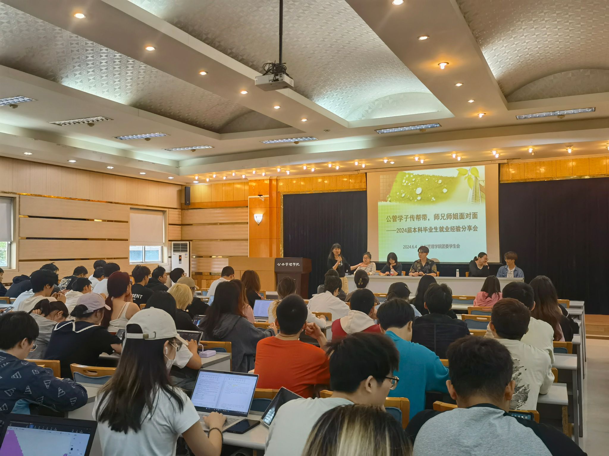 就业升学服务质量,帮助2025届本科学生在各自的职业发展赛道上更快明晰目标,制定计划,做好充分准备,2024年6月4日下午13:00,学院在202报告厅举办了“公管学子传帮带,师兄师姐面对面”——2024届毕业生就业升学经验分享会。本次分享会分别邀请2024届毕业生在国内考研升学、境外留学、考取公务员和选调生以及签约企业四条不同类型就业途径上的“就业明星”来到分享会现场。会议由学院团委书记、本科生2021级辅导员徐柳老师主持,2021级全体本科生同学积极参与。