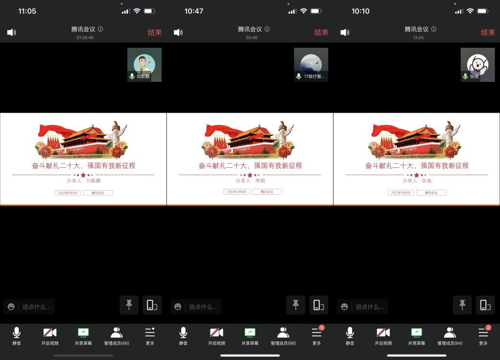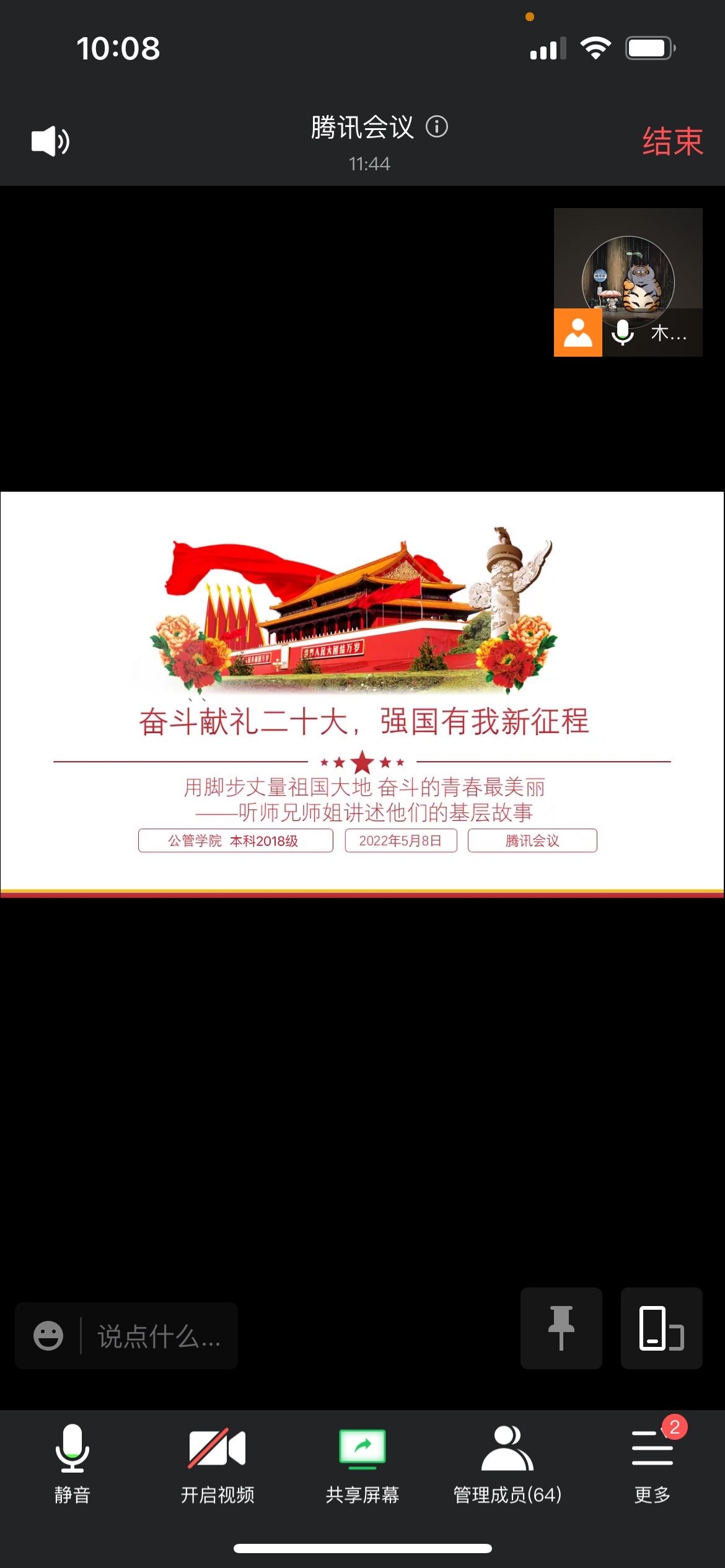 于2020年5月8日通过腾讯会议召开“奋斗献礼党的二十大,强国有我新征程”系列活动:“用脚步丈量祖国大地 奋斗的青春最美丽——听师兄师姐讲述他们的基层故事”主题线上分享会。会议邀请了三位扎根祖国西部基层地区的学院优秀毕业生,分别是2018届本科毕业生张驰,作为基层公务员现工作于西藏昌都;2021届本科毕业生李韬,作为基层选调生现工作于甘肃兰州;2021届本科毕业生刘彰麒,作为基层选调生现工作于广西桂林;请这三位师兄师姐为还在校的2022届本科毕业生分享他们的基层工作故事和工作感悟。会议由院团委书记、2022届本科毕业生辅导员徐柳老师主持,近70余名本科毕业生到会参加。会上大家积极提问、互动频频、气氛热烈。