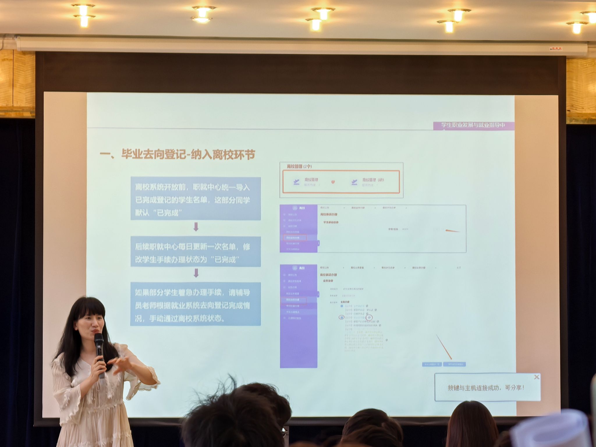 此外,徐柳老师依次介绍了学校集体户的户口迁移流程、党团组织关系转移流程与毕业典礼、双证领取等毕业相关重要事宜,梳理了材料填写清单与重要时间节点。