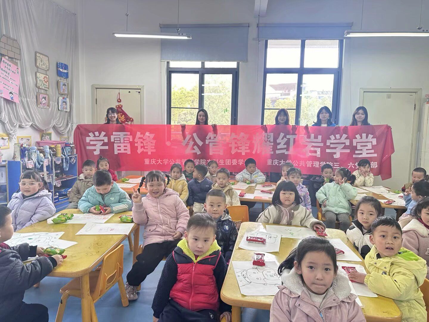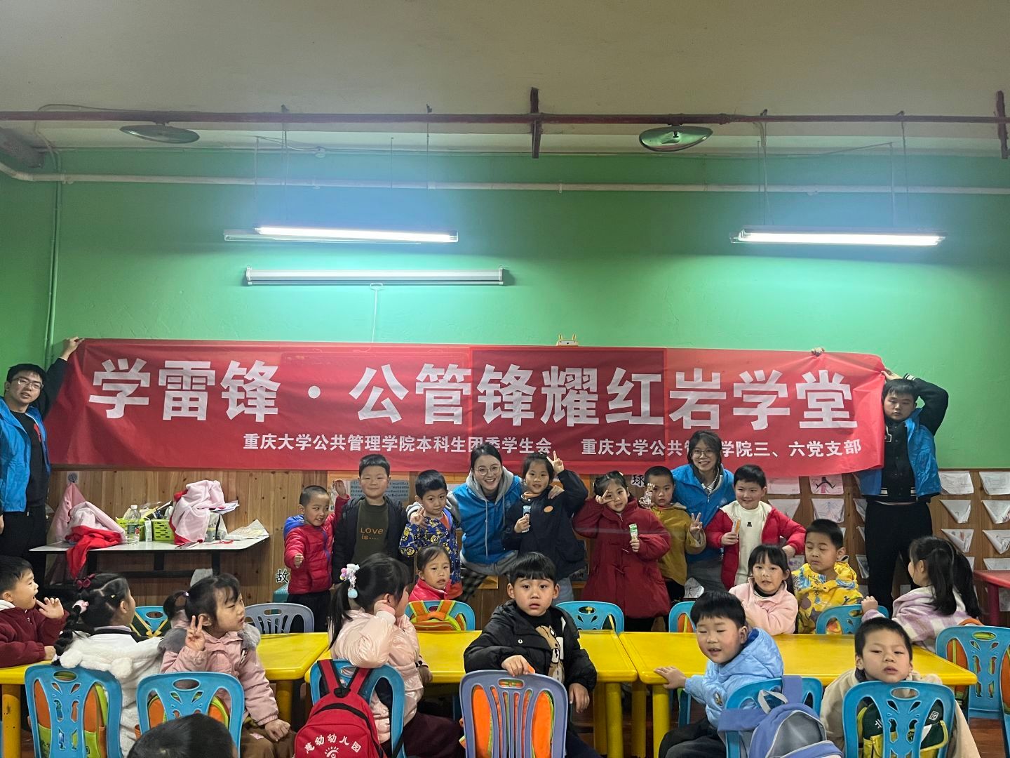本科生团委学生会联合重庆市沙坪坝区凤鸣山社区、工人村社区共同开展了“学雷锋・公管锋耀红岩学堂”主题宣讲和志愿服务活动。宣讲和志愿服务团由团委学生会成员和2023级本科团员青年共30名志愿者组成,分别前往新桥小学幼儿园以及北极星幼儿园,开展雷锋精神、红岩精神的宣讲和志愿服务活动。