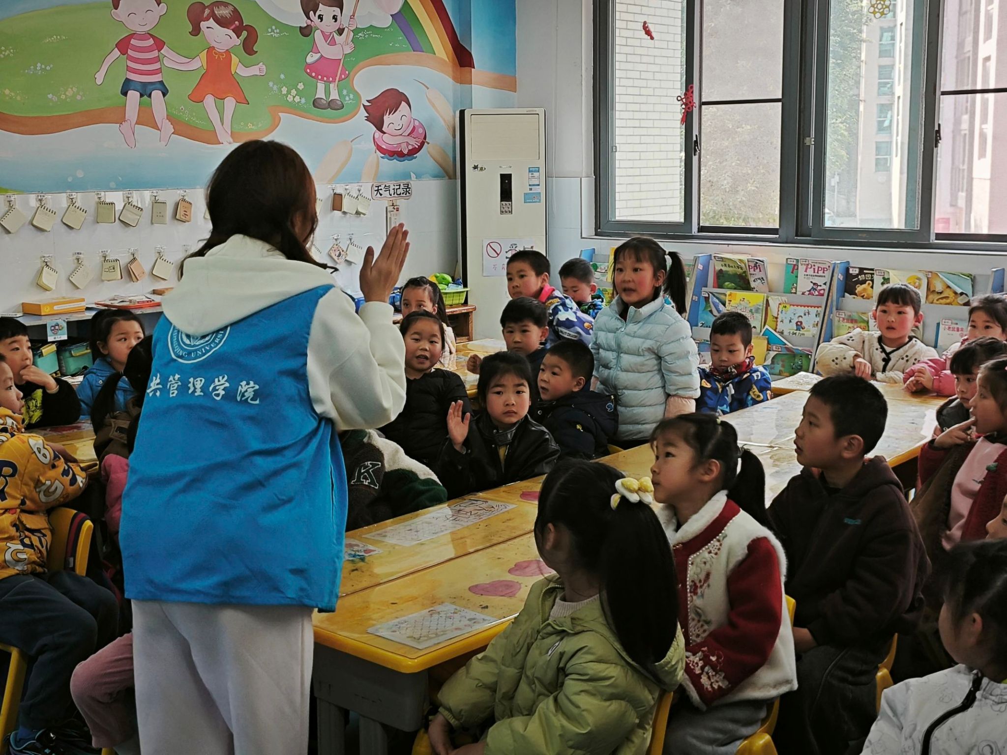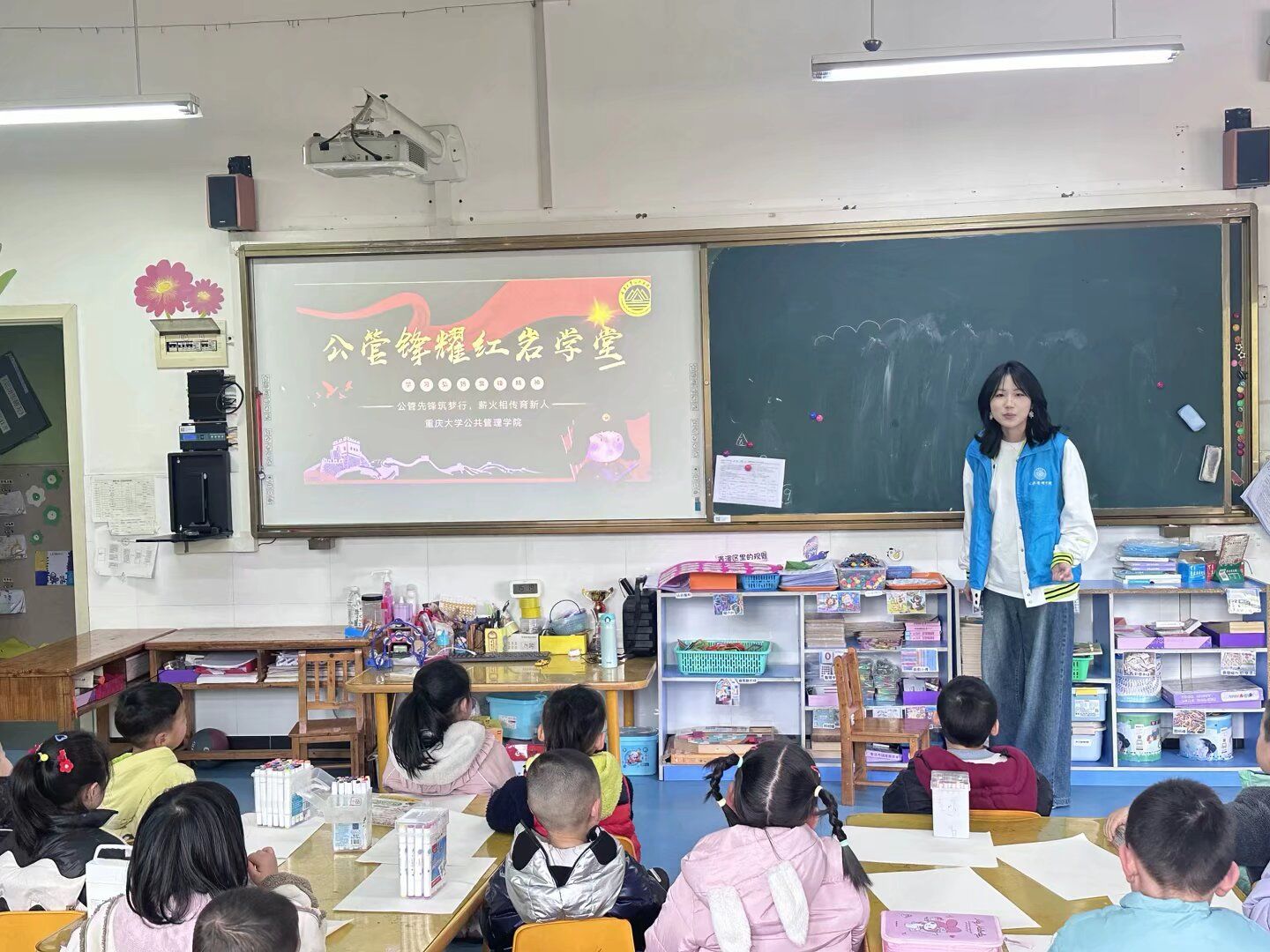 在新桥小学幼儿园大班,志愿者们讲述的雷锋和红岩经典故事深深吸引住小朋友们,他们一个个瞪大眼睛,全神贯注,小脸上满是对故事中英雄人物的好奇与敬佩。在教唱《学习雷锋好榜样》时,小朋友们热情高涨,小手挥舞着,嘹亮的童声充满了整个教室。