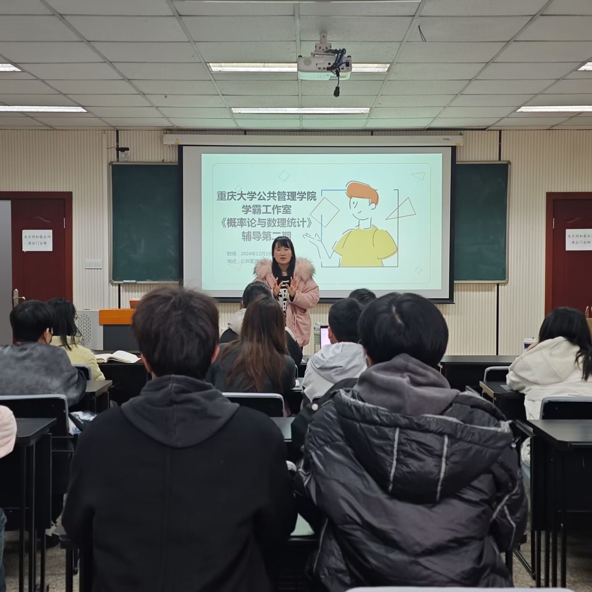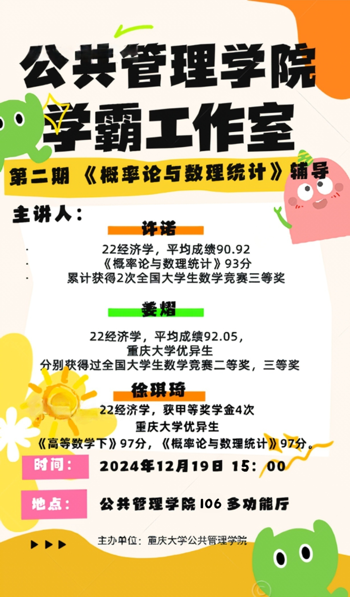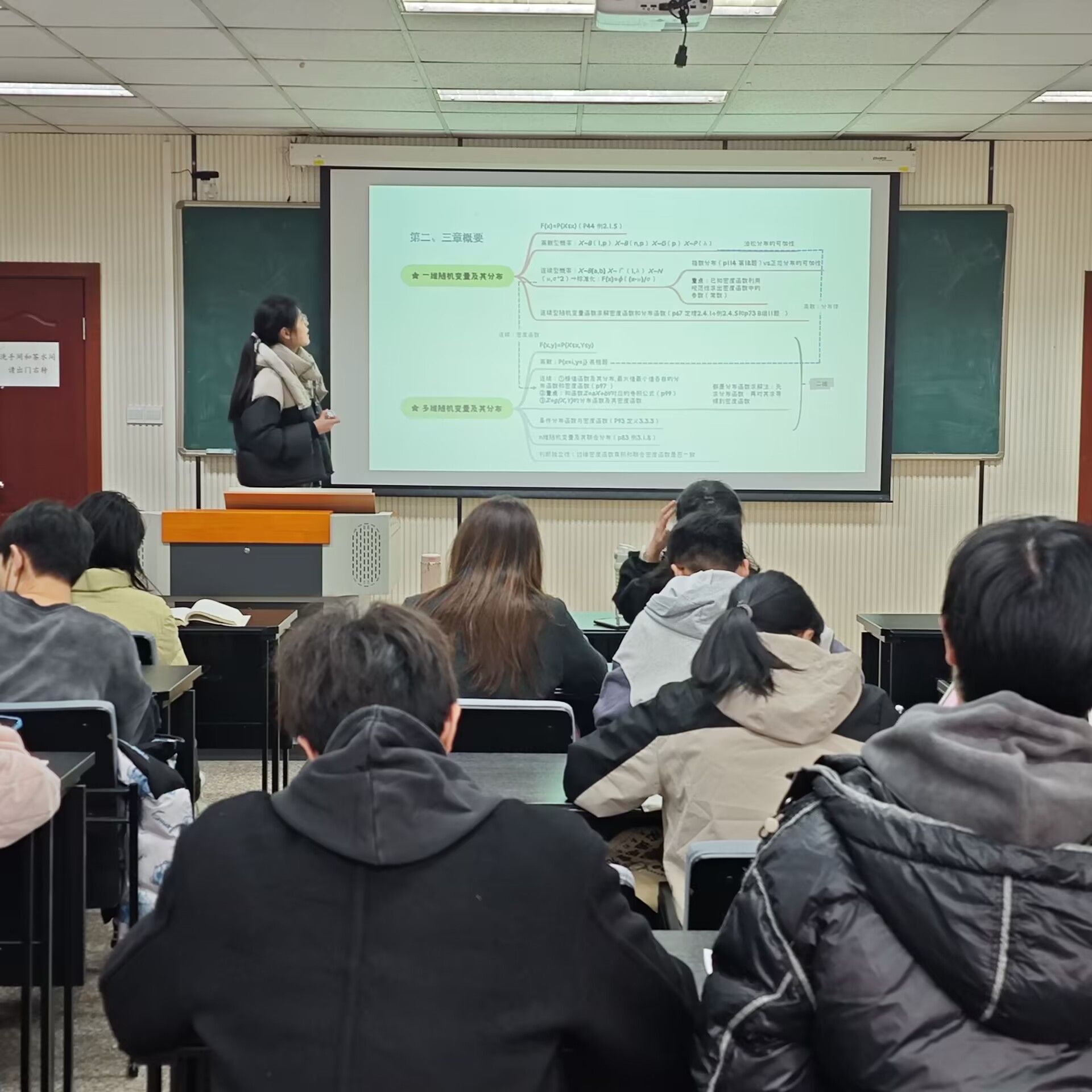 “学霸工作室”第二期《概率论与数理统计》期末考前辅导在学院106教室顺利举行,主讲人为学院2022级经济学专业的许诺,姜熠和徐琪琦,团委书记兼21级、23级辅导员徐柳老师及本科2023级学生到场参与。