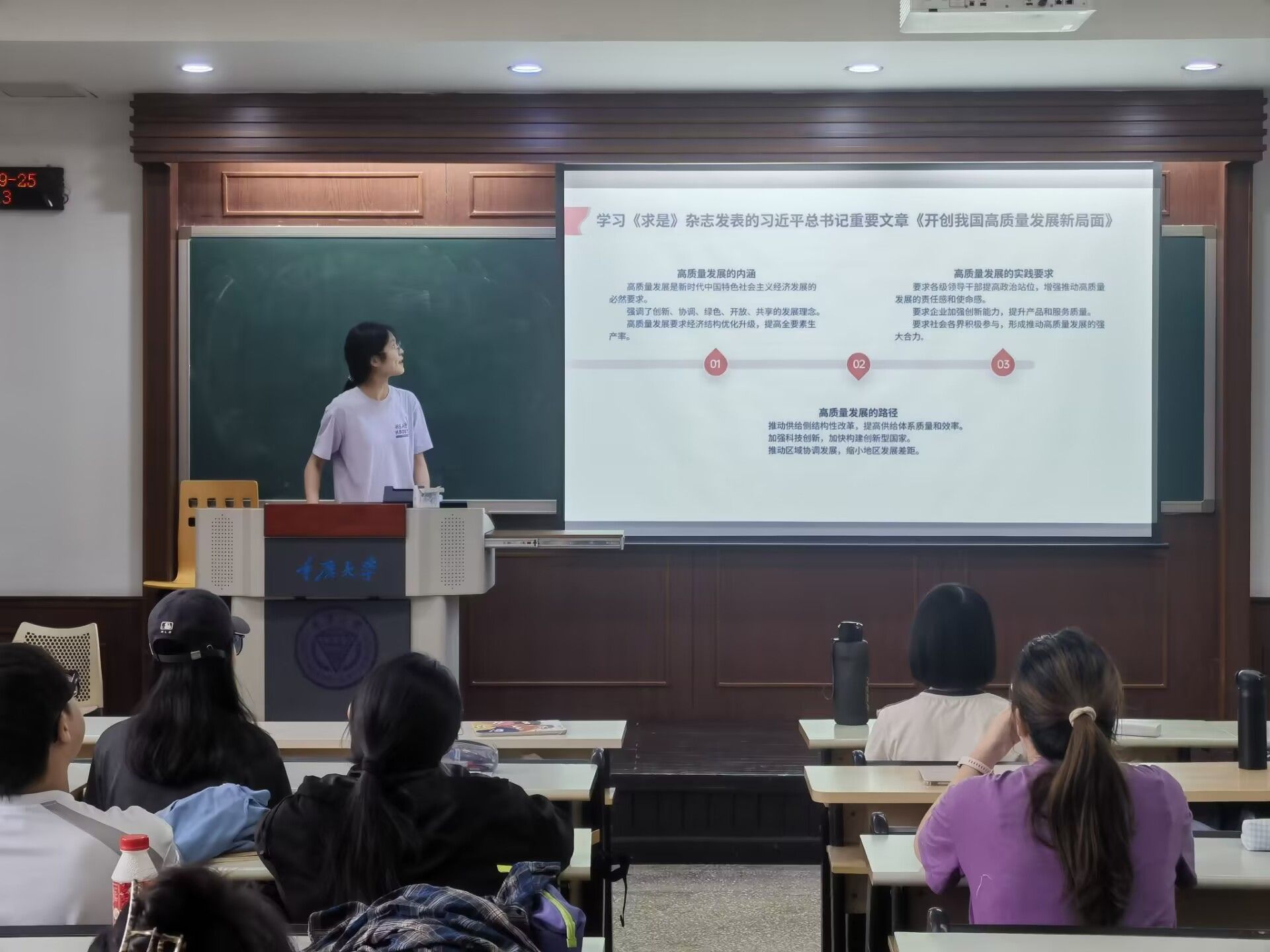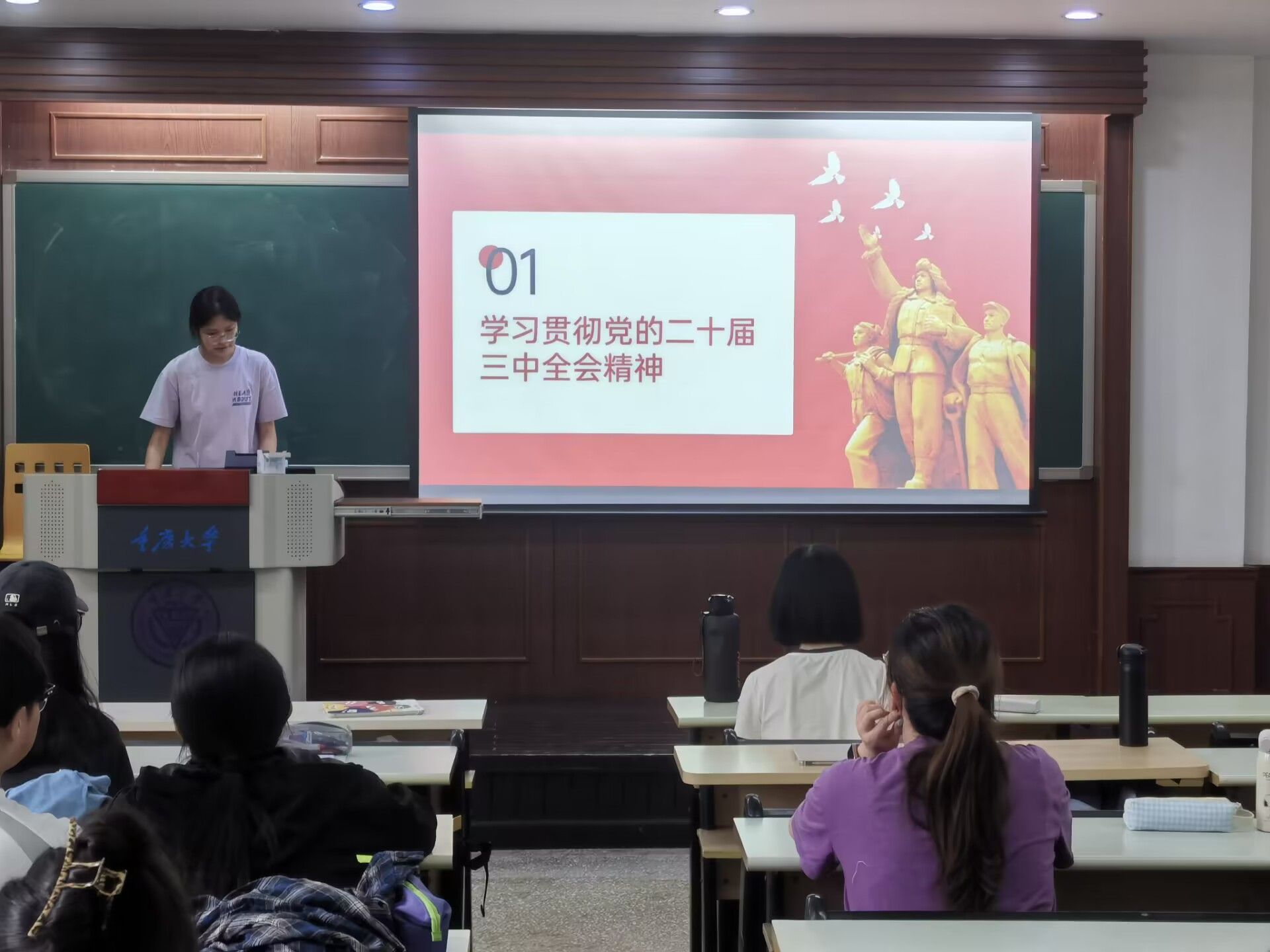活动伊始,班级团支书姜熠首先向同学们详细讲解了党的二十届三中全会精神的内涵。通过对《求是》杂志中习近平总书记重要文章《开创我国高质量发展新局面》的讲解,同学们对党的最新理论成果有了更加清晰的认识,更加坚定了跟党走的决心和信心。在讲解过程中,同学们认真倾听,专心学习,积极互动,踊跃发言,现场氛围浓厚。