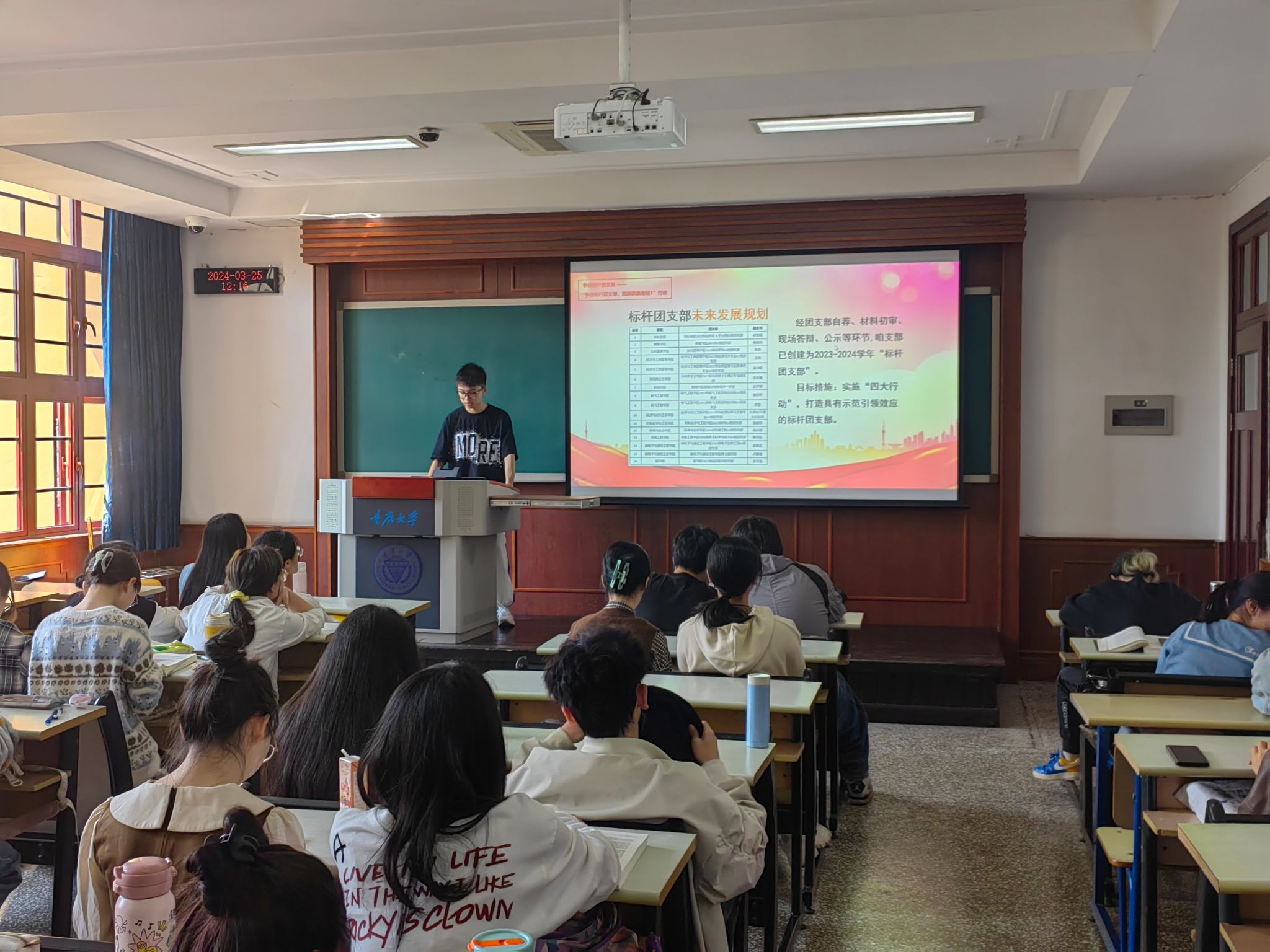 唯一的入围团支部)。为了抓深抓实这项工作,3月25日,经济学1班团支部召开了创建动员部署会,发动全班同学以此为契机,齐心协力打造坚强堡垒,全力以赴发挥团员先锋模范作用,努力实现各方面工作都走在前列。团支部书记朱雨支持会议。
