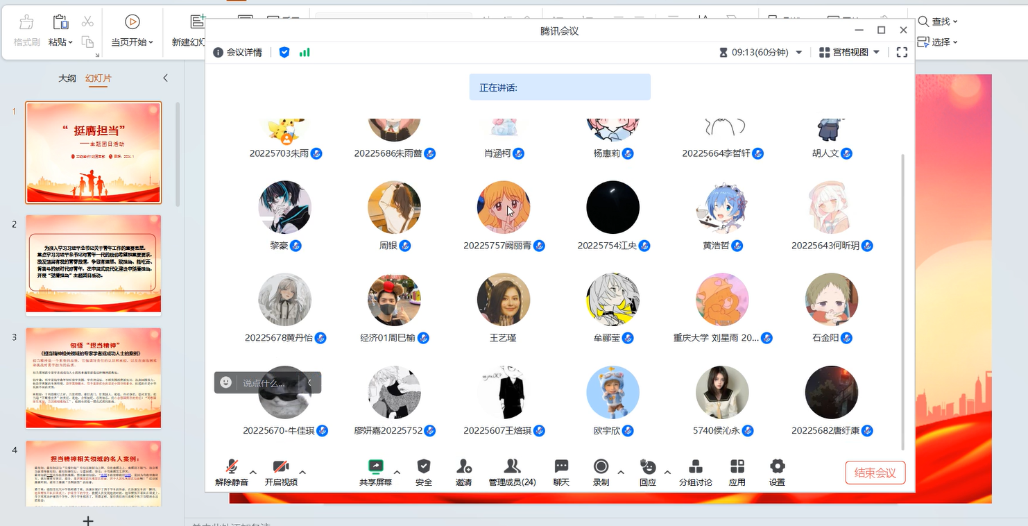 团日的第二个议题是“领悟担当精神”。通过学习讨论,同学们认识到,担当精神是一个重要的品质,它强调对责任的认识和承担,以及在面临困难和挑战时勇于担当的品质,这正是推进中国式现代化伟大事业的内在要求,我们青年一代要敢于担当、勇于担当、善于担当。黄丹怡同学激动地说,钱学森放弃高额薪水,双手重新抓住的却是中国导弹事业,扶起的亦是中华民族不屈的灵魂。侯沁永同学深情地表示,林则徐“苟利国家生死以,岂因祸福避趋之”,他拥有的是一颗英武的民族魂。刘星雨同学则在总结中发表了自己的深刻感悟,担当精神是中华民族历史的沉淀,是华夏文明精神的瑰宝,更是革命实践力量的凝聚。作为新的历史的创造者,我们在经典故事的阅读中回溯到火红的革命年代,在创新理论的实践中实现坚定的担当抱负,在滴水穿石的奋进中激扬向上的时代伟力。同学们相互交流了各自的心得体会,抒发了各自的奋进之心,表达了各自的担当决心。
