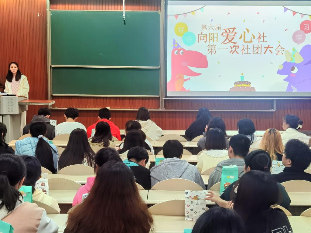 第六届第一次社团大会全程由刘梦瑶和张晓彤两位同学主持。破冰大会伊始,社员们领取到了向阳爱心社精心准备的小礼物。社长林炜忻发表社长致辞,对上一学期的工作情况进行总结,正式拉开大会序幕。团支书荣召康在随后的讲话中明确了社团的基本信息及注意事项,并与社员们分享了自己对“近水楼台先得月,向阳花木易为春”这句诗的独到感触。人们对前半句诗总是烂熟于心,对后半句诗却经常不曾提及,而这恰似向阳爱心社强烈想要改变的局面,即为角落发声,为边缘呐喊,想要通过自己的努力将那些弱势群体送去阳光能够照到的地方,让他们也能够面朝太阳,春暖花开。大家对此产生了强烈的共鸣,情不自禁地鼓起掌来。