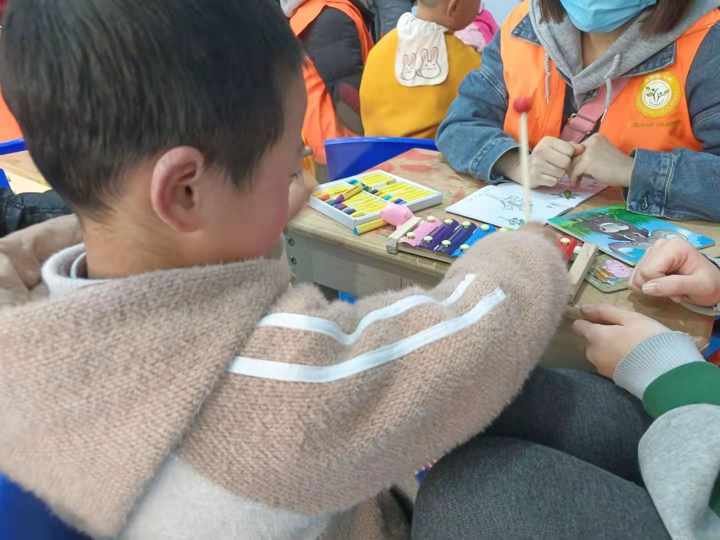 在相处过程中处处展现着温暖与爱。志愿者们会耐心给孩子们演示手中的玩具,让孩子们收获快乐的同时,志愿者也在一起体会小玩具中蕴藏的童心的快乐。志愿者们会用纸折出好看的纸花送给给小朋友们,拉着他们的手一起唱歌,一起演奏小乐器。