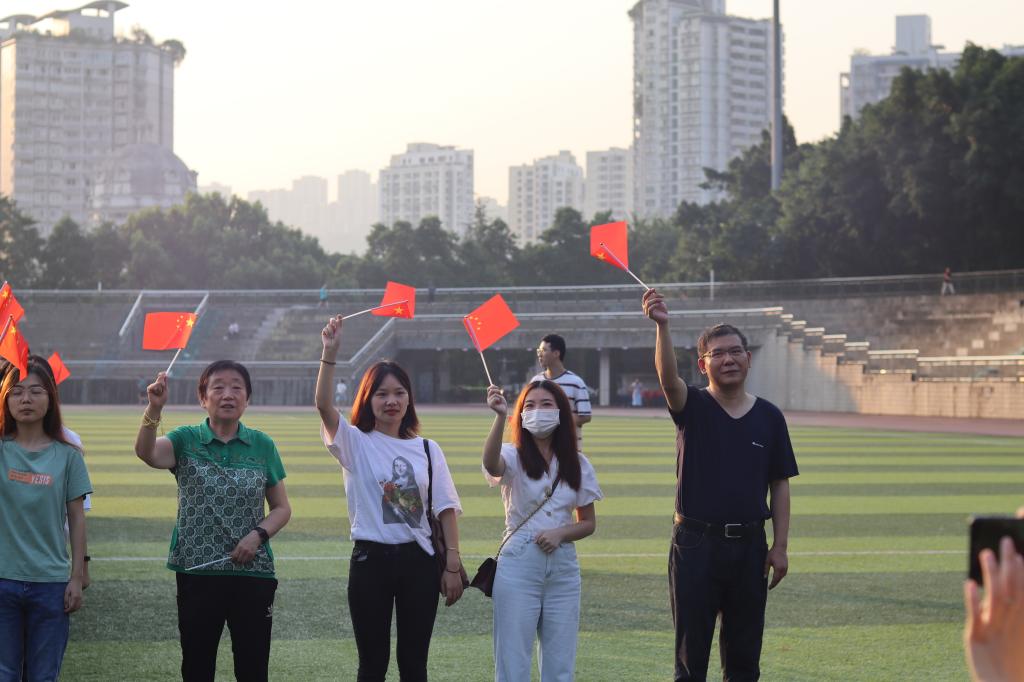 “月光下的中国,大河奔流,白浪溅起满天的星星……”升旗结束,下一个环节是由美视电影学院的同学为我们带来一首《月光下的中国》。雄浑深情的嗓音缓缓述说着壮丽的诗歌,一字一句皆是对祖国最真诚的祝福。最后一个环节,全体师生挥舞着手中的国旗,齐唱《歌唱祖国》,共同献礼国庆,祝福祖国。熟悉的旋律和慷慨的歌声让同学们热血沸腾,一曲唱毕,同学们高喊“请党放心,强国有我”,对报效国家,投身社会主义建设做出自己的承诺。