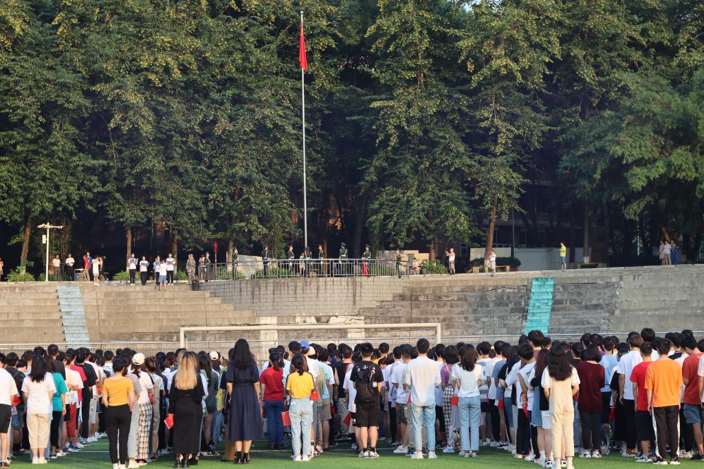 清晨的第一缕阳光洒向大地,天空泛起鱼肚白,同学们早早地来到了思群广场,伴着十月的徐徐微风,排列成整齐的四路纵队,等待着升旗仪式的开始。“国旗班,出旗!”一声令下,国旗班的旗手迎着朝阳,手持鲜艳的五星红旗,踩着奏乐的鼓点踏步进场。同学们全体立正,默默注视着国旗的出场。