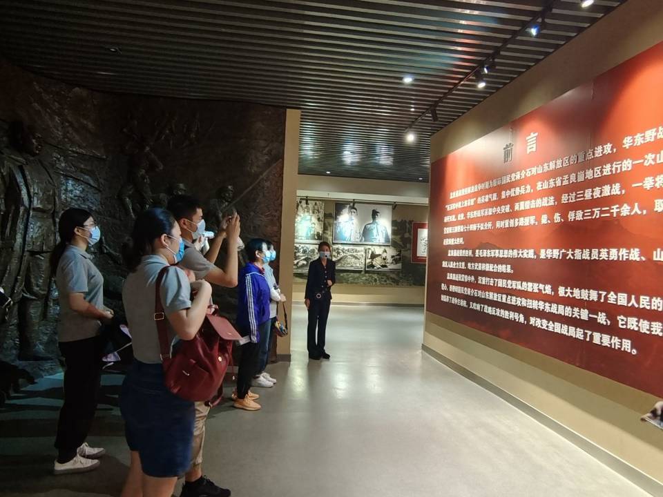 下午,实践团转道孟良崮战役遗址,在往昔战争的碎片中感受华东野战军同整编七十四师的浴血奋战。沿着时间的坐标轴,同学们在纪念馆了解了战役经过以及华东野战军的战斗序列表和参战部队的进攻和阻援情况。纪念馆后师烈士墓地,墓地正中是粟裕将军骨灰撒放处。讲解员向同学们说到:“粟裕将军曾对夫人口述遗嘱,希望死后将其骨灰撒在曾经频繁转战的八个省市的土地上,与长眠在那里的战友们一起。”深深的爱国情怀与战友们的兄弟情谊感动了实践团的同学们,也让同学们更加深刻地了解了“水乳交融,生死与共”的沂蒙精神的内核。