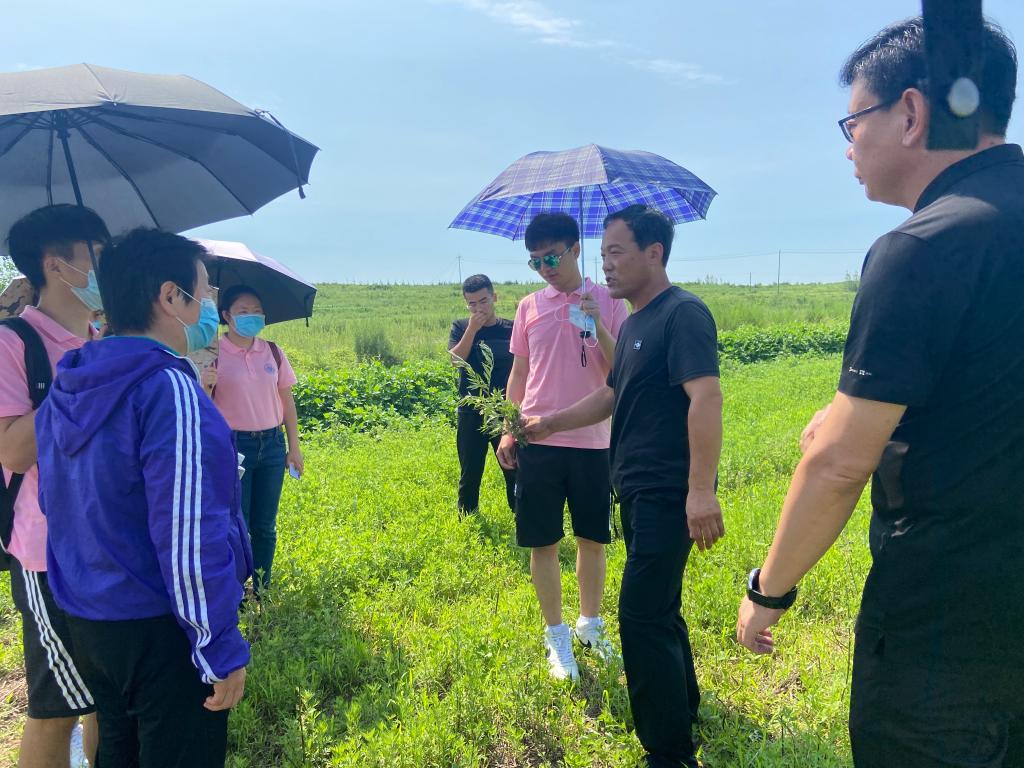 “长岭有艾,健康长灸”,跟随着镇长的脚步,团队成员来到田间了解艾草种植的有关技术。一下车,艾草独特的香味扑鼻而来,镇长摘下田间新鲜的艾草,向同学们介绍艾草的种植过程、生长规律和产量等。