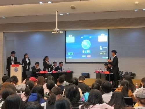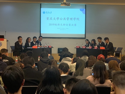 19级新生辩论赛总决赛于图书馆1F-9报告厅准时开始。学班主任兼18、19级辅导员王丽娟,辅导员助理谢镇江到场观赛。17级校辩论队队员马璇,公管研究生辩论队队长谢思捷,2016级校辩论队队长张炜昀担任评委。18级本科学院院辩论队队长张迁担任主持,副队长李露凝担任比赛计时员。