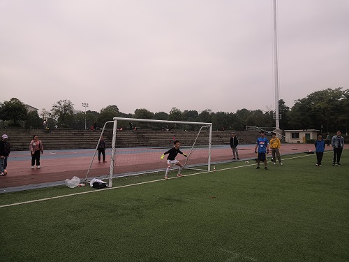 最后,比赛进入到精彩的点球大战。双方所有球员进行轮流射门踢球,并各自选出一名门将进行防守。点球大战在双方轮流进球后进入到2:2的比分,最终只剩18级最后一名队员未点球,俯身、出脚、划出弧线,完美进球,宣告了本次比赛18级以一分的优势成功获胜。赛后,18、19级比赛双方互示友好,并在王老师的组织下进行了合影留念。