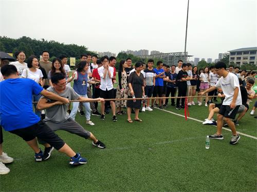 不久,作为重头戏的拔河比赛开始了。双方队员紧握绳子,一个个脚蹬着地,身体后倾,都铆足了劲为自己的队伍贡献出自己的一份力量,场外的观众也齐声呐喊。同学们的拔河结束了,场外观看的老师们却忍不住了,刘书记和王老师拿起绳子也要“较较劲”。这样温馨的画面就此定格,作为同学们宝贵的记忆。活动进行至最后,全体师生合影留念。