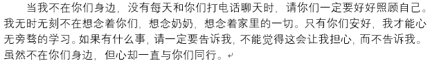 也许有人会问,在信息时代之今日何不用一个电话解决?因为爱有时无法用言语表达,字里行间流淌的真情,往往更令人感动。羞于口头表达,欲表歉意的男生的一句“爸,对不起”,父子之间的矛盾涣然冰释,一切尽在不言中;心思细腻的女生,在纸上细细诉说,与远方灯下的母亲一起分享喜怒。“雁字回时,月满西楼,”古人对家书翘首以盼,字字如金,今人同样如此。当夜深人静之时,仅仅是因为“想孩子了”,年迈的父母不忍打扰学业繁忙的孩子们,于是又翻出泛黄的信签纸品读,生怕错过每一个字。千言万语在纸上不过数行,无论是感慨万千的话语还是简单的一句问候,都能让人触动。三言两语,父母便红了眼……