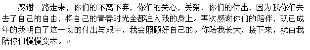 成长,要有一颗感恩的心。“羊有跪乳之恩,乌有反哺之义”,从孩童到现在,父母教我们做人的道理,辛苦把我们从襁褓养大成人,鞠躬尽瘁地操碎了心,一直在背后默默无闻地给予支持,不曾在你陷入低谷时离去。我们总是在索取,父母却在无私奉献,不求回报。做父母不容易,你一定看过父母偷偷抹眼泪的背影、无助的神情和憔悴的面容。为人父母的辛酸,也许只有做父母的年纪才能体会地刻骨铭心。为人子女的,要学会感恩。这些年来,多少人未曾开口说出那句埋藏心里的话?