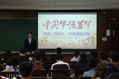 如果说其他的选手们是以宏大的历史为视角,那么来自16级经济四班的谢睿则是以父亲戍守祖国边疆的动人故事阐释了自身从小对于国防的认识。在演讲的末尾,他由衷讲道,“父亲从军离家多年,是因为祖国需要他。我从小生长在一个军人家庭,明白聚少离多是别无选择。让我们热爱人民军队,协心共筑钢铁长城!”话音未落,台下即响起热烈掌声。