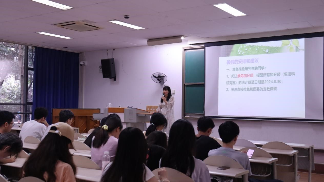 会议开始,徐老师对本学期同学们的学业状况进行了总结,指明同学们的问题所在,勉励同学们利用暑假时间认真复习,精进学业,完善自己。随后,为同学们梳理未来两年的学业和就业规划安排,警示同学们一定要充分利用假期时间做好人生规划,提醒同学们尽早确立80%努力的目标和20%努力的目标,有的放矢,安排好精力和时间。针对不同就业规划方向的同学,徐老师还提出了详细的暑期安排建议:建议准备推免研究生的同学关注推免加分项并注意加分截止日期;建议国内考研的同学收集目标学校、确定目标、制定复习计划;建议准备出国留学的同学收集历年相关信息、分析形势和难度、准备语言考试;建议准备就业的同学收集职业信息、确立大致方向、完善简历;准备考公务员的同学参加高质量的暑期实习、实践,关注考公复习计划等等。