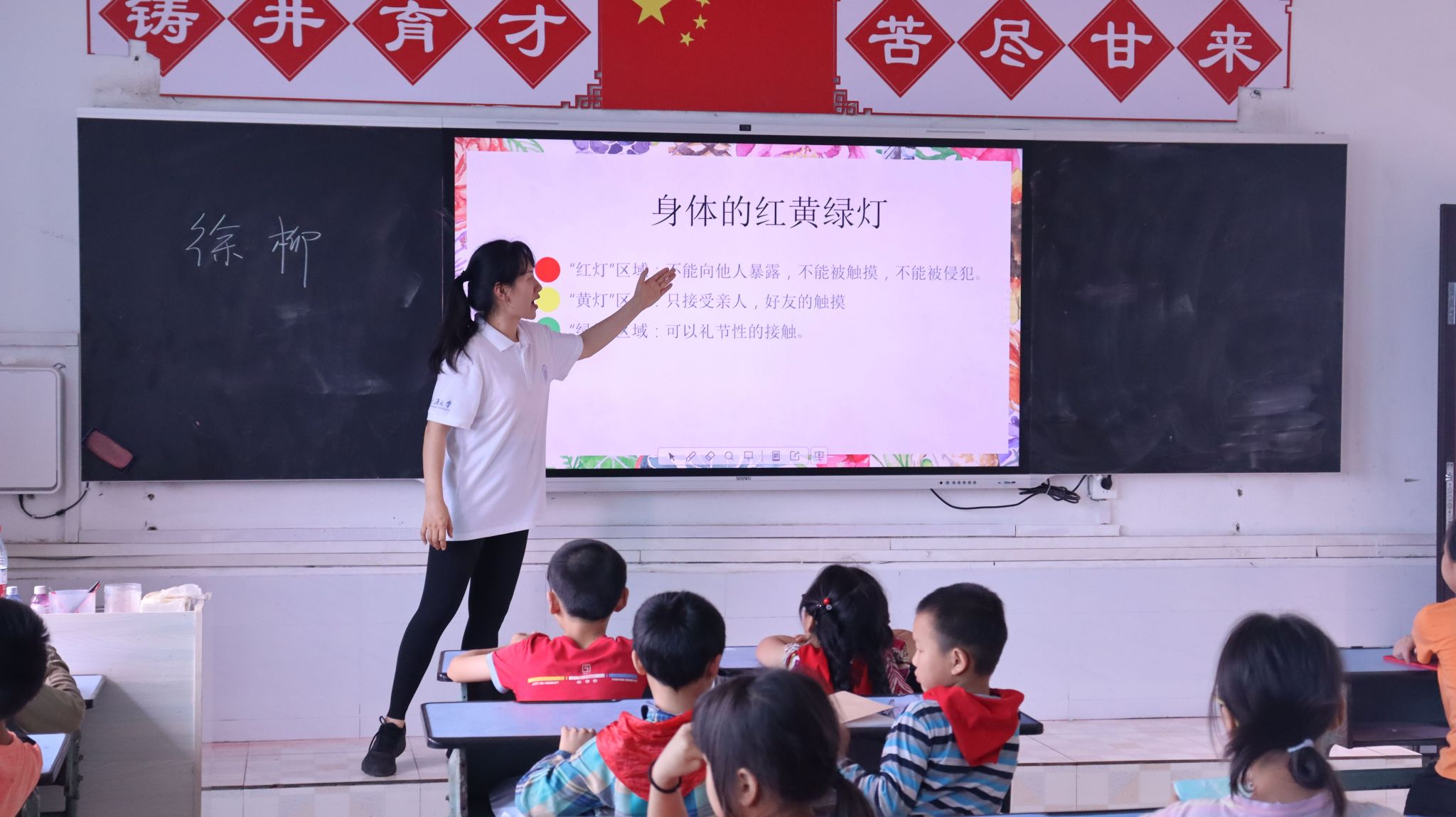 实践团带队老师徐柳依托个人心理学专业背景,为孩子们带来一堂《心若向阳 快乐成长》心理健康与性教育的特色课程。徐老师从动画片片段切入,引导孩子们充分认识自我,学会悦纳自我,建立积极的自我意识;从生命的诞生开始,给孩子们带来了别开生面的性教育第一课:性别的差异、儿童到青春期发育特征、身体的红绿灯区域,教会学生保护自己的隐私,预防性侵害事件的发生。