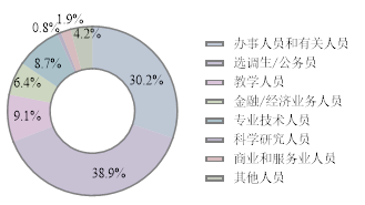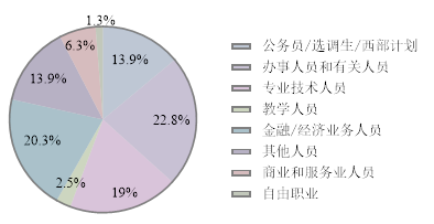 硕士毕业生就业职业较本科生更为集中,有一半都在公共管理、社会保障和社会组织中,以选调生或公务员居多。2020届选调生共18人,普通公务员共85人,总共占就业总数的39%,其中的79%集中在重庆市;金融/经济业务人员17人,占比6%,基本都在金融业;专业技术人员为23人,占比9%,分布在房地产业、制造业、卫生和社会工作、交通运输等;担任教学人员共有24人,占比9%,其中一半以上都在高等教育机构,其次在中初教育单位较多;办事人员及其他人员共91人,占比38%,广泛分布于公共管理社会保障组织(26人)、制造业(13人)、商务服务业(9人)、房地产业(7人)、建筑业(7人)、交通运输(5人)、信息传输(5人)等等;科学研究人员2名,分别是规划研究员和高校科研助理;另有5人为商业和服务业人员,基本都在房地产行业。
