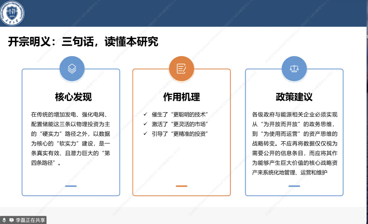 李磊围绕“公共数据开放对城市能源韧性的影响”这一主题,从核心发现、作用机理和政策建议三方面展开深入阐述。他首先从能源的时代背景切入,结合韧性的三大维度解析了城市能源韧性的概念,指出传统治理路径的瓶颈,强调从数据的力量来寻找“软实力”从而开辟新思路。他强调,公共数据是国家战略的风向指向了从“信息”到“生存要素”的数据革命,有效的数据开放可以是提升城市能源韧性的“金钥匙”。李磊阐述传统能源面临的核心障碍,介绍公共数据的开放作用,回顾了政策效果的动态演变以及剖析了区域上的差异。在赋能路径方面,他指出了催生更“聪明”的技术、激活更“灵活”的市场引导更“精准”的投资等途径,并提出应从生态、经济、社会、设施等多方面综合考虑韧性建设。