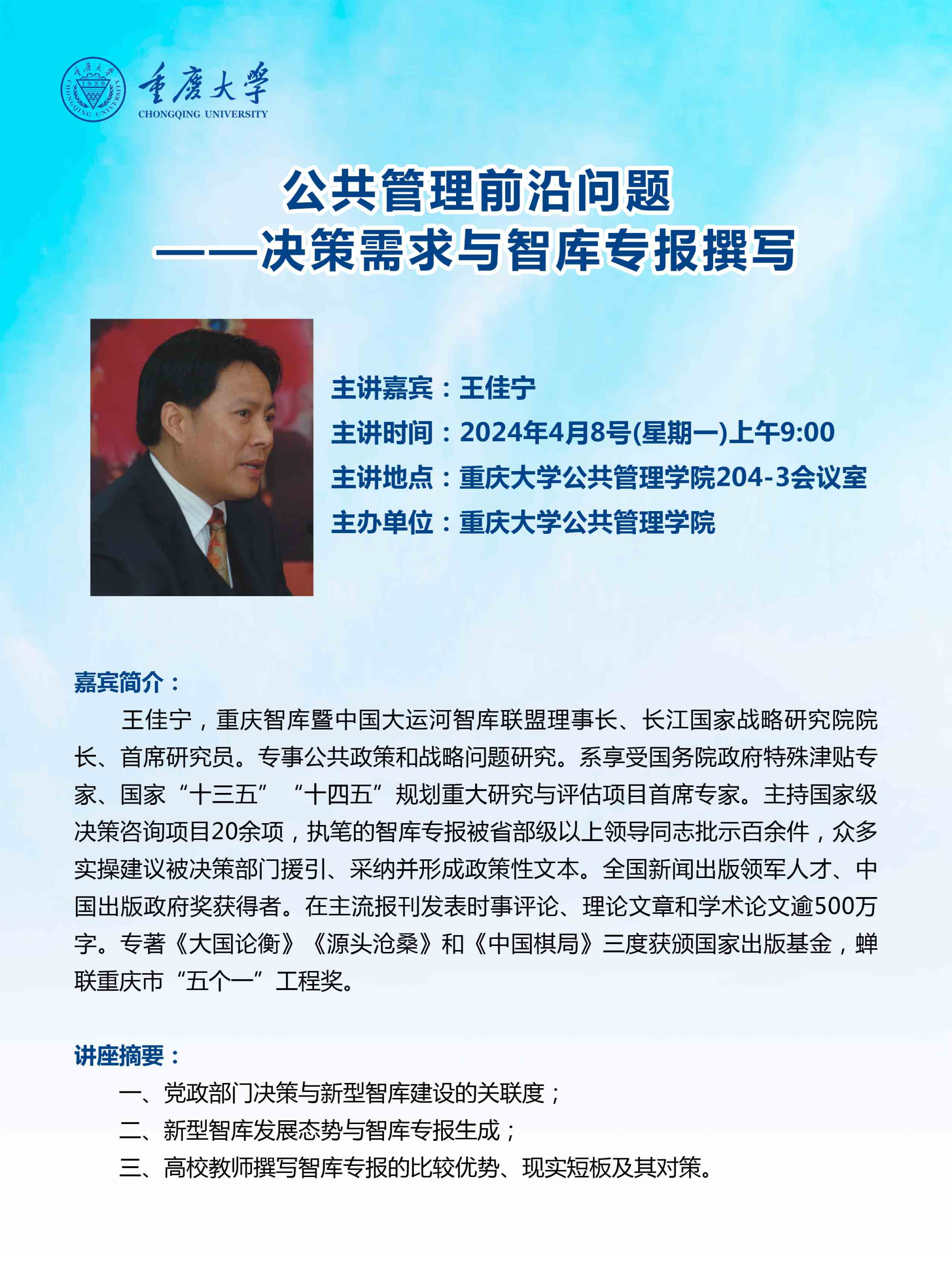 2024-04-232024年4月8日上午9点,重庆智库暨中国大运河智库联盟理事长、长江国家战略研究院院长、首席研究员王佳宁受邀于百合小说 进行关于决策需求与智库专报撰写的学术讲座,同百合小说 教师、学生就智库专报等相关公共前沿问题的理解与经验进行分享。百合小说 副院长王辉副教授、学院教师以及相关专业研究生参加座谈,学术讲座由王辉主持。王佳宁从农村三变革实例出发,深入浅出的讲解了智库专报如何服务于中央与地方的决策需求,智库...