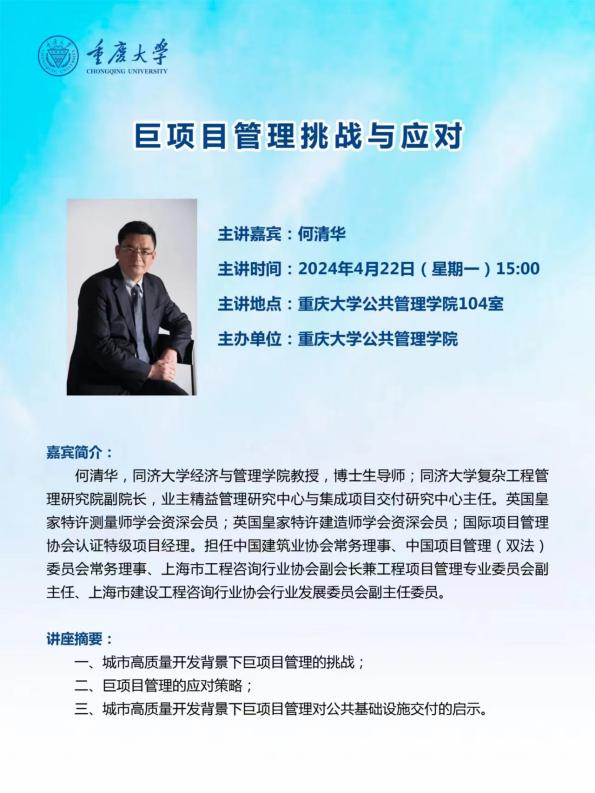 2024-04-282024年4月22日下午15点,同济大学经济与管理学院教授、博士生导师、同济大学复杂工程管理研究院副院长何清华教授受邀于百合小说 进行关于巨项目管理挑战与应对的学术讲座,同百合小说 教师、学生就巨项目特性、交付困境等相关问题的理解与经验进行分享。百合小说 学科教师以及相关专业研究生参加座谈,学术座谈由薛斌副教授主持。何清华教授从标杆案例实践及启示出发,深入浅出地讲解了巨项目特性的基本逻辑、巨项目复杂性特征...