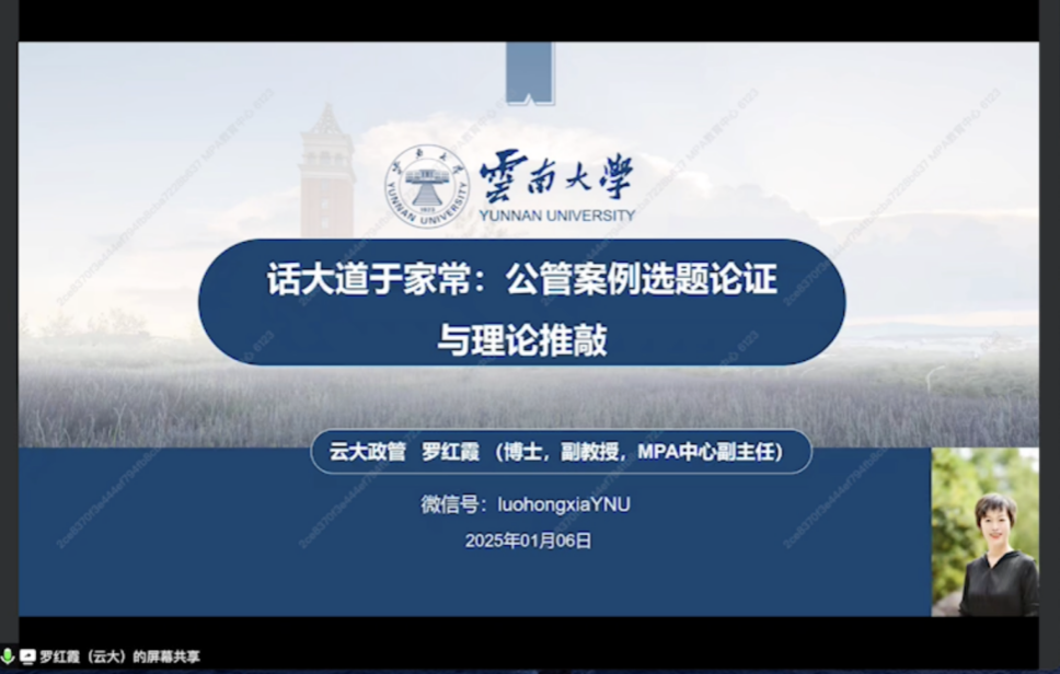 2025-01-142025年1月6日,百合小说 特邀云南大学政府管理学院副教授、云南大学MPA中心副主任、全国MPA优秀教师罗红霞线上为师生分享以“话大道于家常:公管案例选题论证与理论推敲”主题讲座。 学院王辉副院长主持讲座,学院多名老师及MPA学生参与学习交流。讲座开始前,王辉简要介绍了罗红霞的学术履历和研究方向,对罗红霞的到来表达了热烈欢迎,随后罗红霞对MPA教育中心的邀请表示感谢。罗红霞从祛魅、选题论证、理论推敲、...