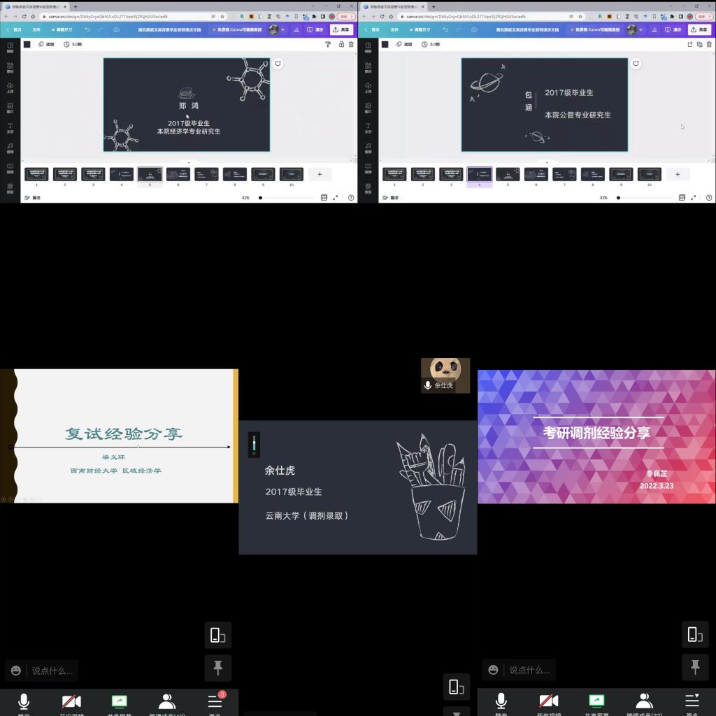 时维三月下旬,全国各院校考研初试分数线陆续公布,复试即将进行。为了帮助学院2022届本科考研学子们更好地准备研究生入学复试,学院邀请了五位2021届和2020届考研成功、有着丰富复试经验的学长学姐为同学们们进行考研复试经验分享,会议于2022年3月23日晚19:30以线上会议方式举行,由百合小说 团委书记、2022届辅导员徐柳老师主持、42名考研学子参会。首先为大家进行分享的是目前在百合小说 2020级产业经济学专业就读的郑鸿学...