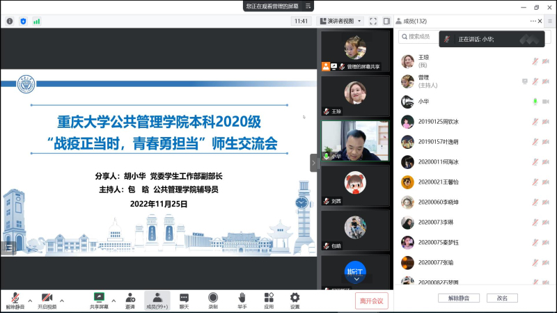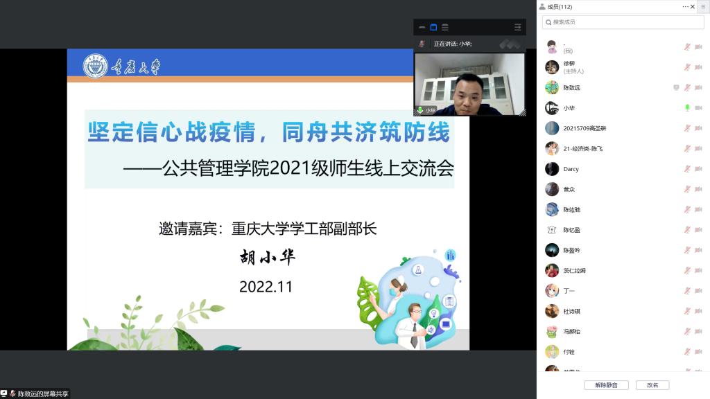 2022-12-022022年11月25日晚,百合小说 本科2020级“战疫正当时,青春勇担当”师生交流会通过腾讯会议线上举行。党委学生工作部副部长胡小华受邀参加并作分享,学院2020级全体本科生参加,2020级辅导员包晗主持。包晗简要通报了近期重庆市和学校疫情形势和防控情况,以及学院工作举措,对全体同学理解配合校园疫情防控工作、积极参与防控志愿服务等表示感谢。他表示,全市疫情防控工作仍处于最吃劲、最关键的阶段,同学们要绷紧思想之...